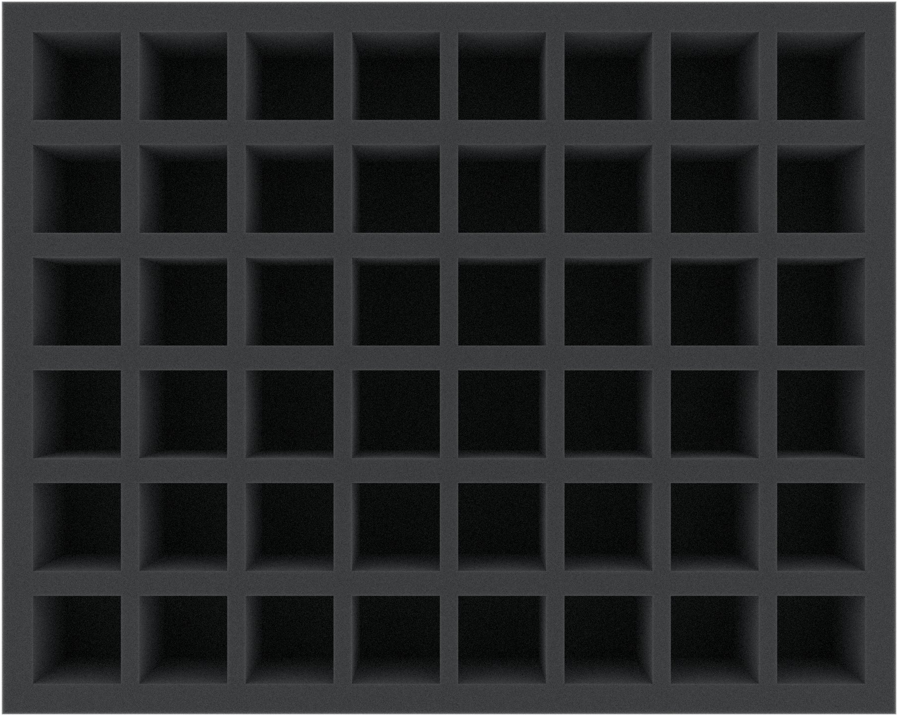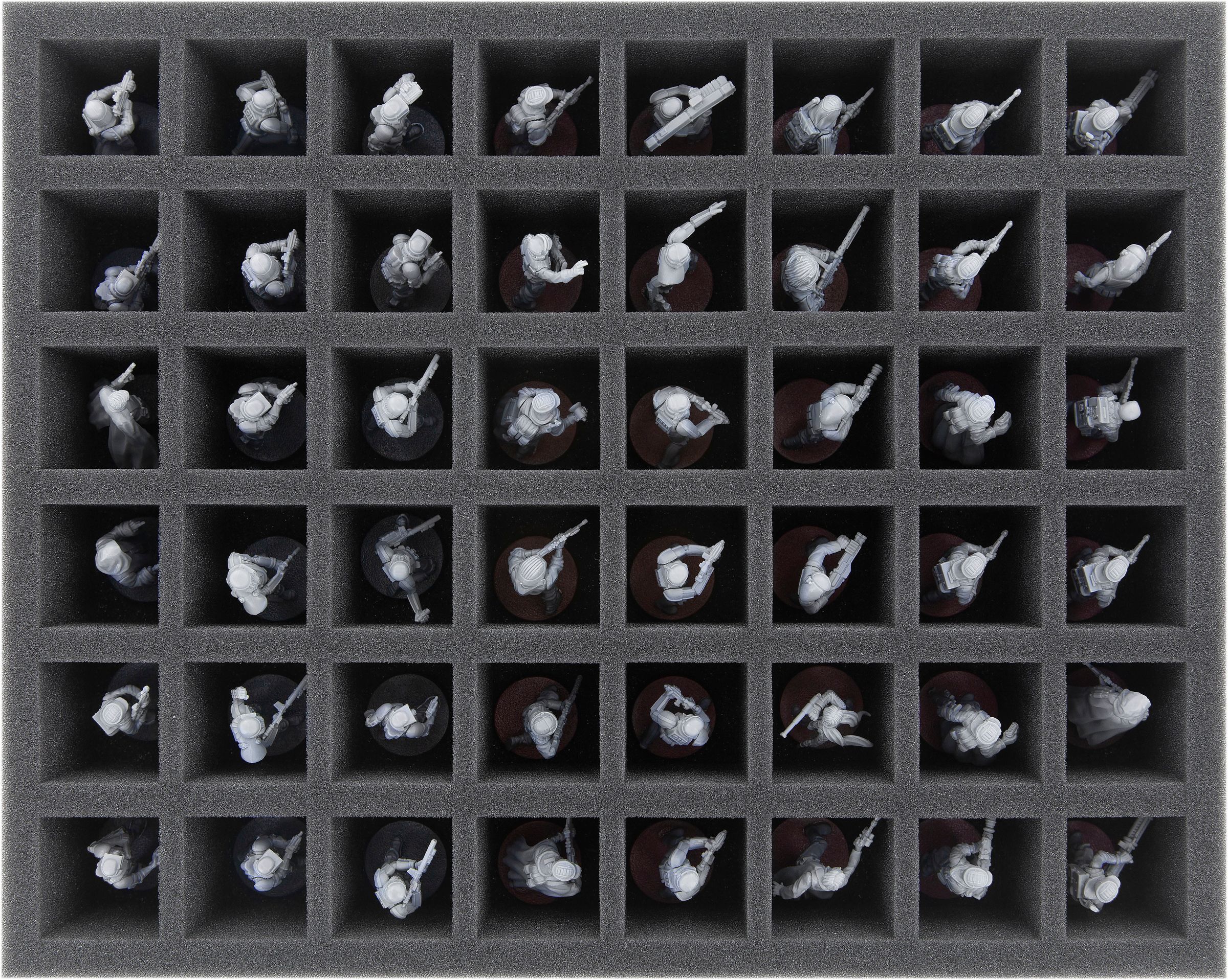 With this Full-Size foam tray up to 48 Star Wars: Legion miniatures get a safe place. The compartments are ideal for storing standard troopers and character figures (25 mm base) up to a height of 45 mm in upright position, and transporting them safely.