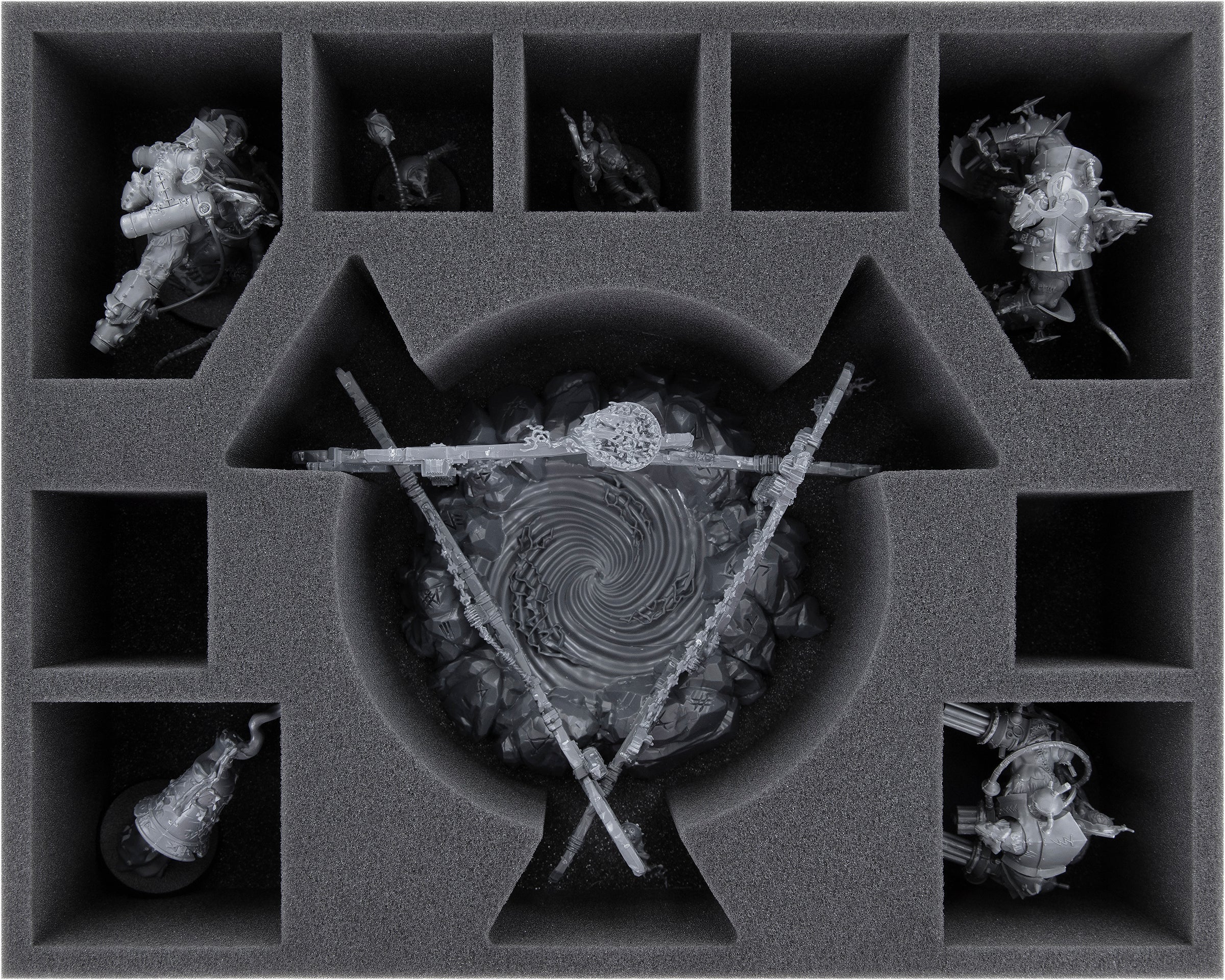 Mighty wooden beams, decorated with bells, chains, and coal basins, extend over the vortex of the Gnawhole miniature. To ensure that no beam snaps and the bells remain on the model for a long time to come, there is this matching Feldherr foam tray for a single Gnawhole and other models.