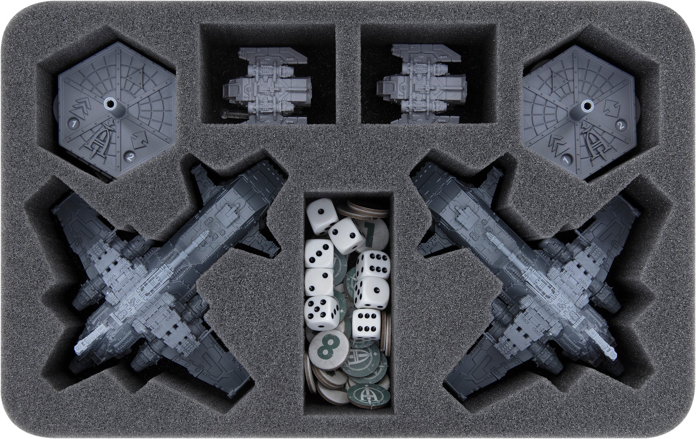 - 2 Half-Size foam trays with 8 compartments each for Xiphon Interceptor, Squadrons Fire Raptor/Storm Eagles + flying bases + flight stems (HS035A047)