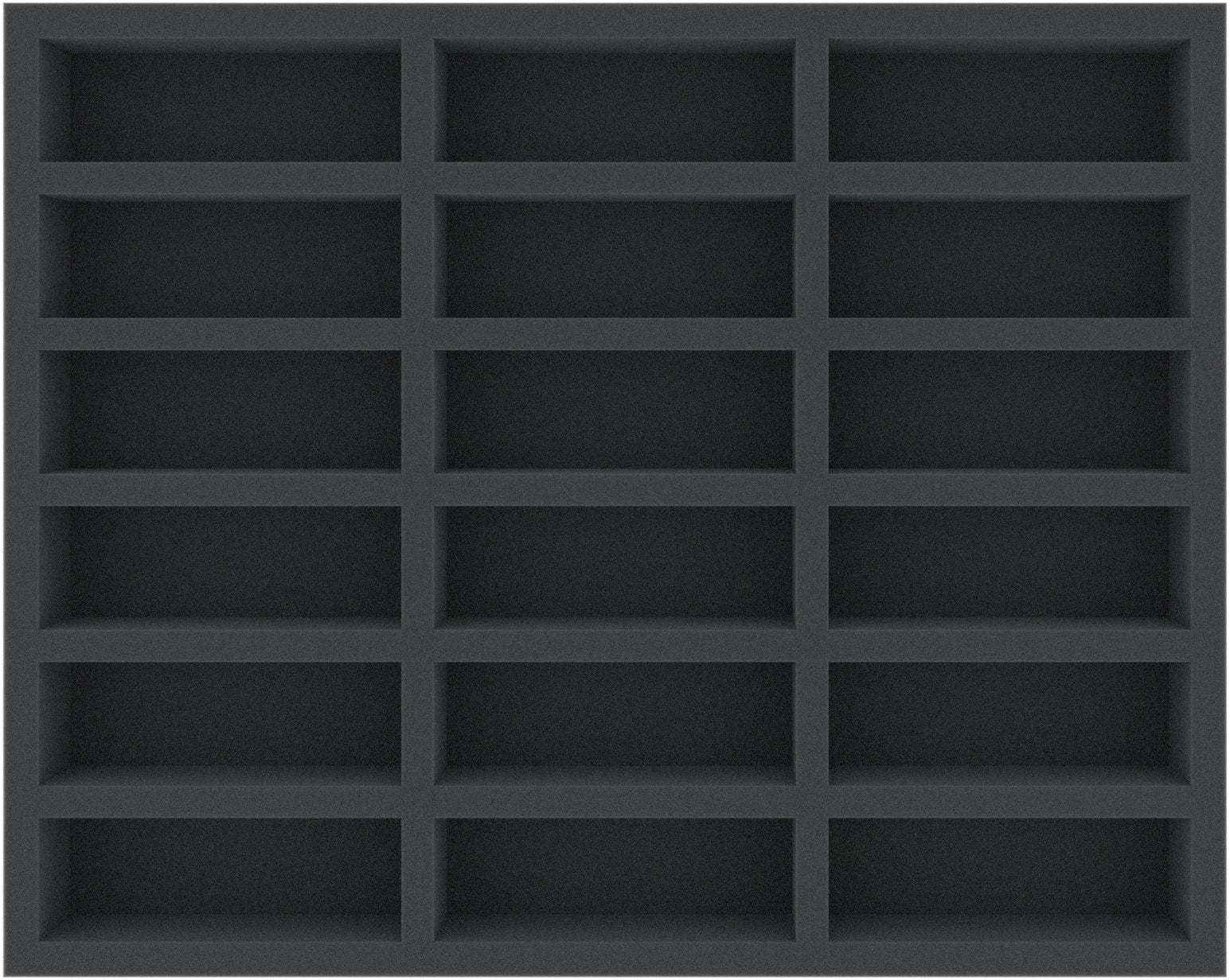 This Full-Size foam tray is divided into 18 oblong and narrow compartments of the same size. It is particularly suitable for elongated tabletop and board game miniatures on bases up to 30 mm, such as standard bearers, as well as warriors with spear, pike and long-rifle.