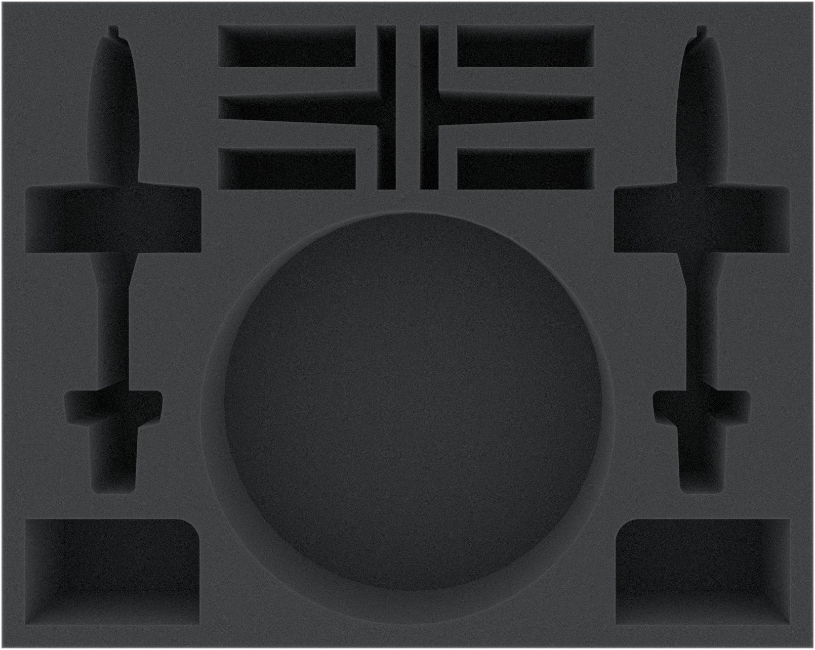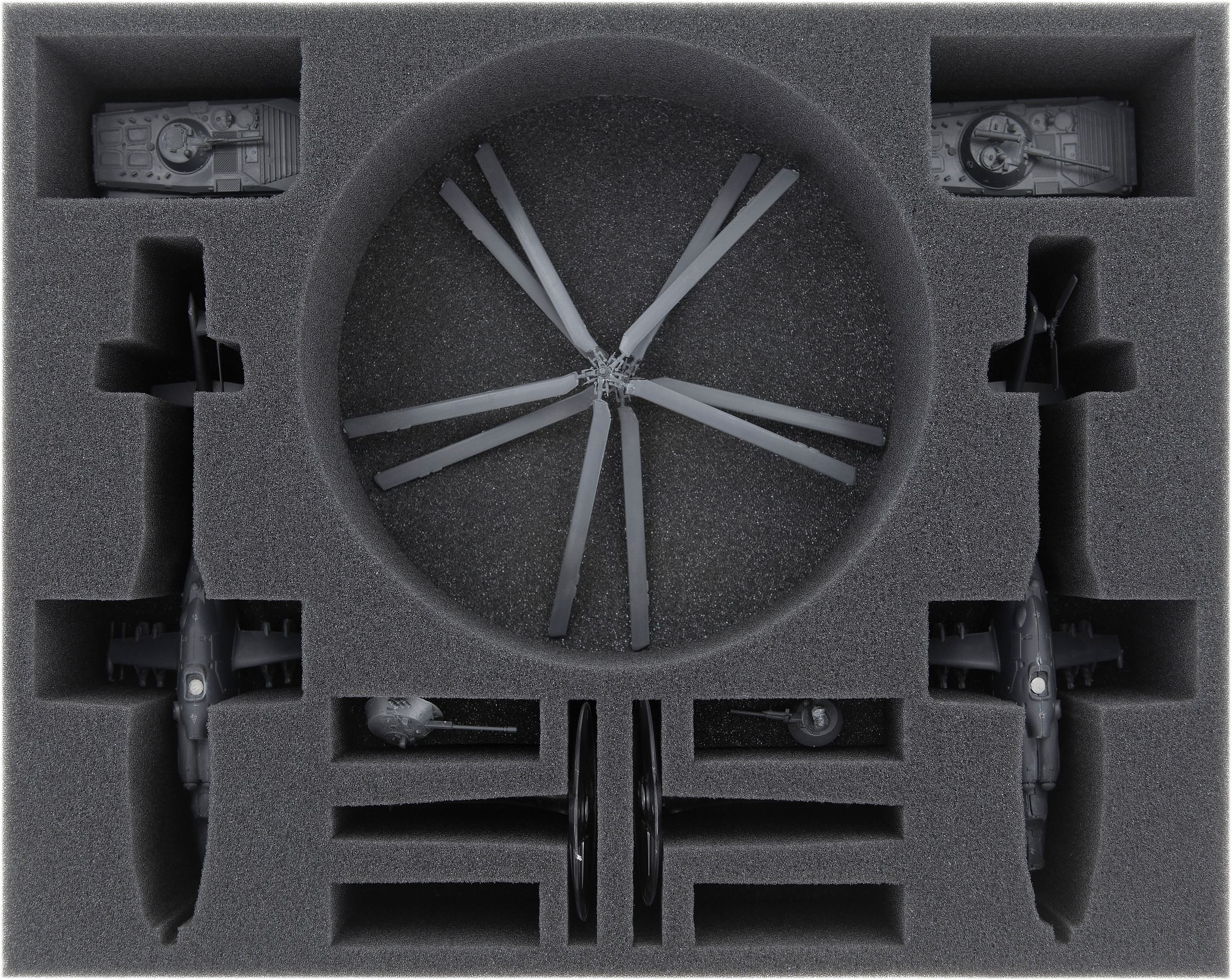 The foam tray has 11 compartments. Two compartments are custom cut for one MI-24 Hind helicopter body each, one round compartment offers space for the rotors. Two further compartments will accommodate two helicopter bases incl. plastic stands. In addition, the tray offers two compartments for one BMP-1 OP tank each as well as four compartments for up to four turrets (BMP-1 OP).