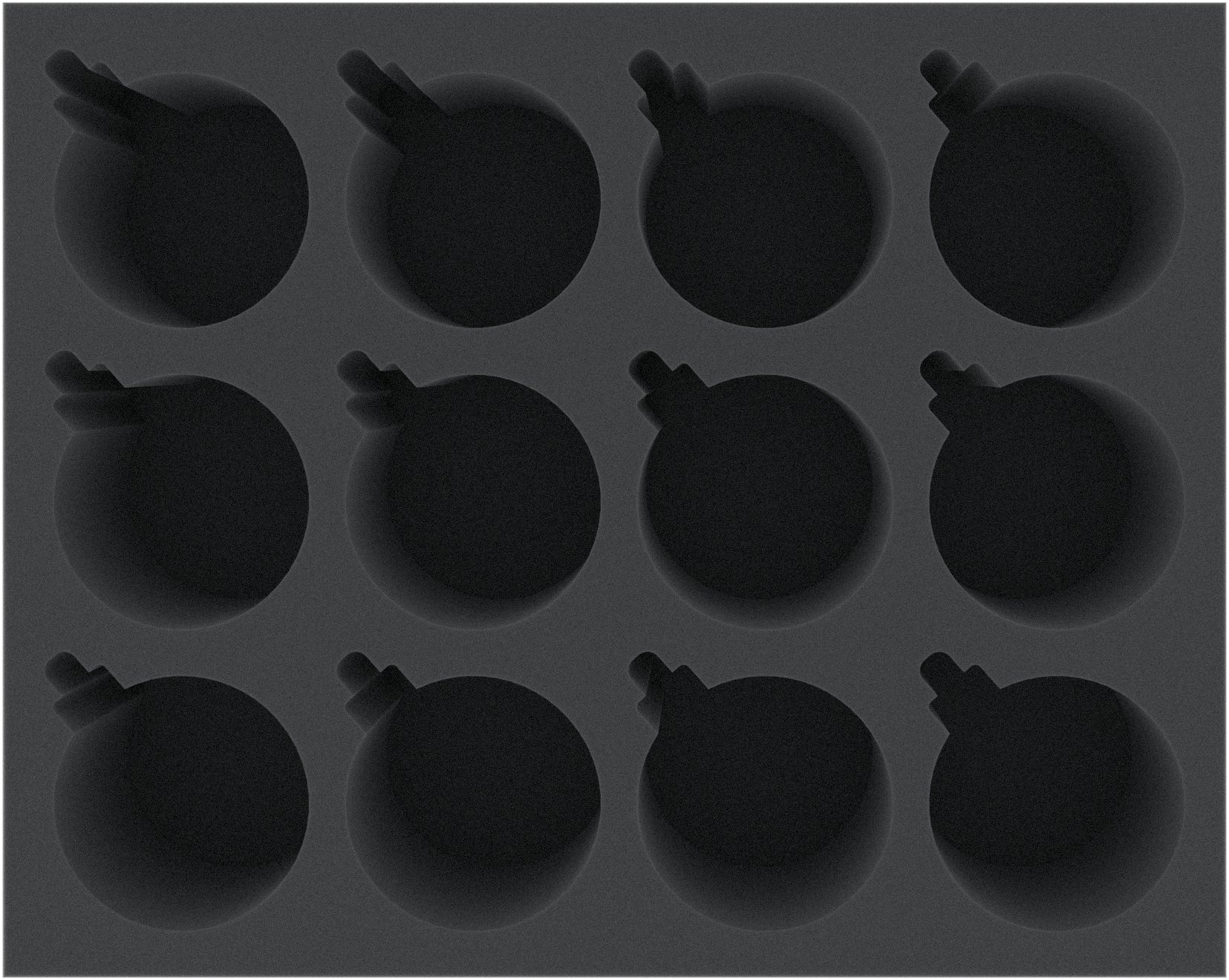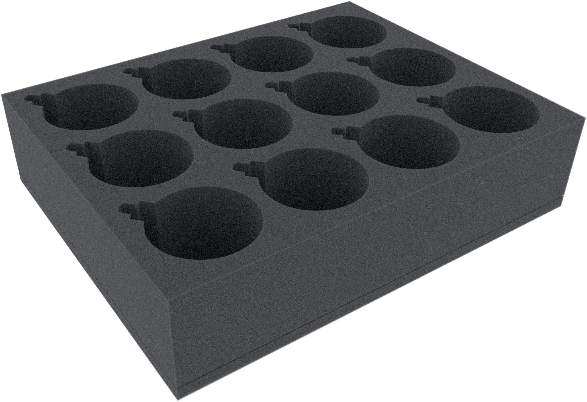 A 80 mm high Feldherr Full-Size foam tray with 12 circular compartments of 70 mm diameter with small bell- or lamp-shaped extension.