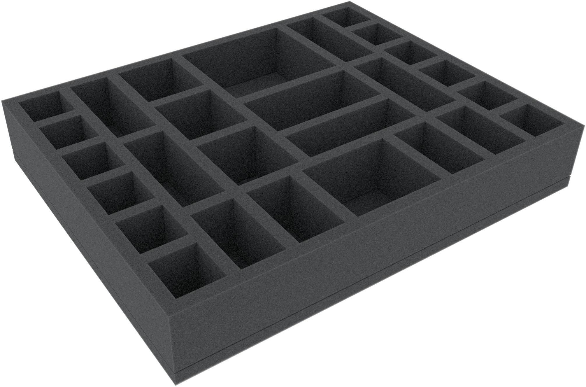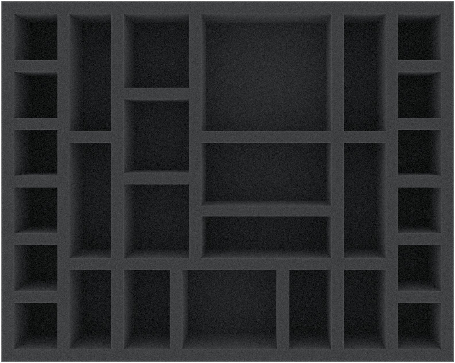 This Full-Size foam tray is divided into 27 compartments. The compartments of different sizes are ideal for safely storing miniature sets of mixed sizes for various board games and tabletop wargaming systems.