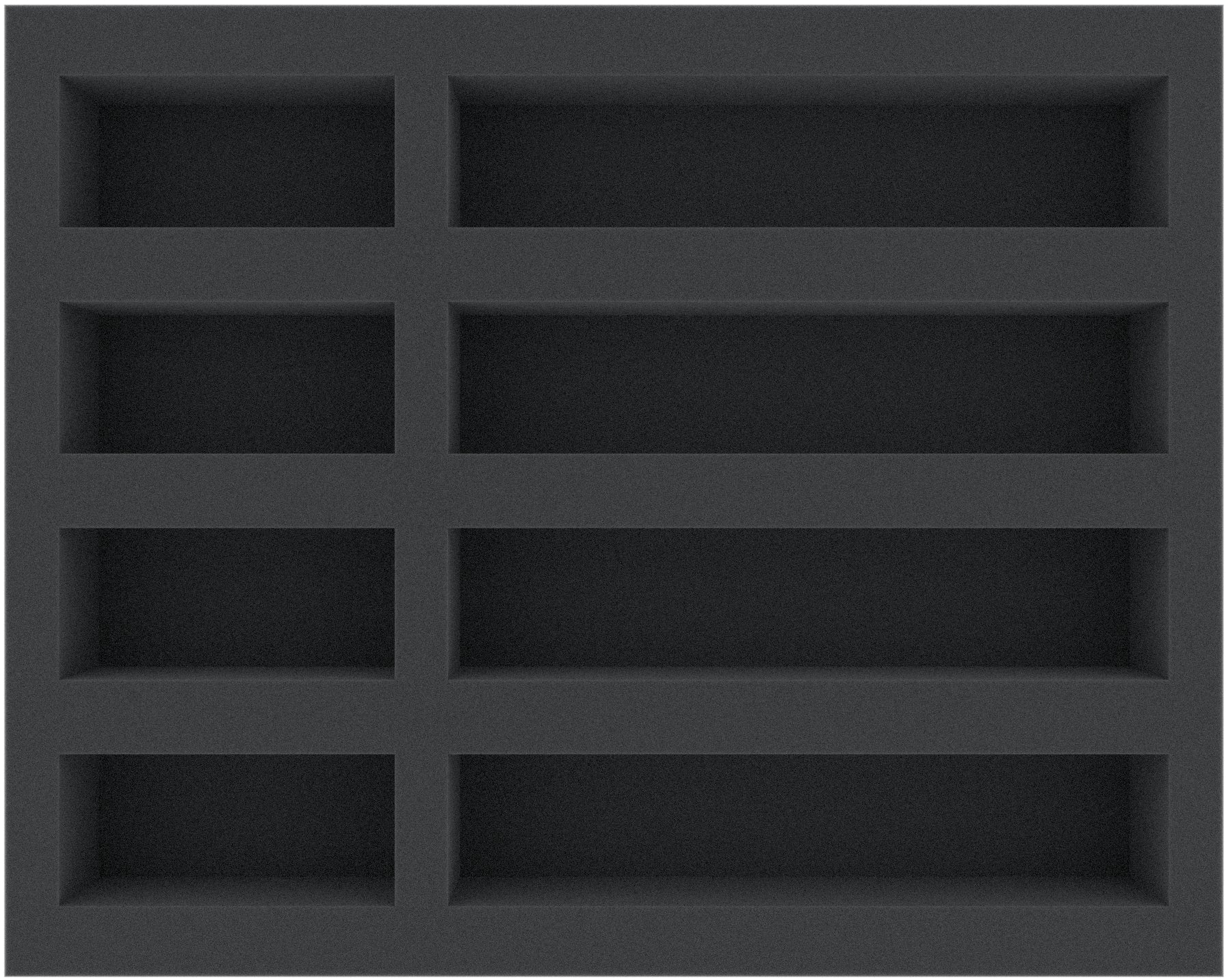 This 30 mm mm high foam tray is divided into 8 compartments. It is particularly suitable for the safe storage of tabletop and board game miniatures, model train accessories, as well as other fragile models and small parts.