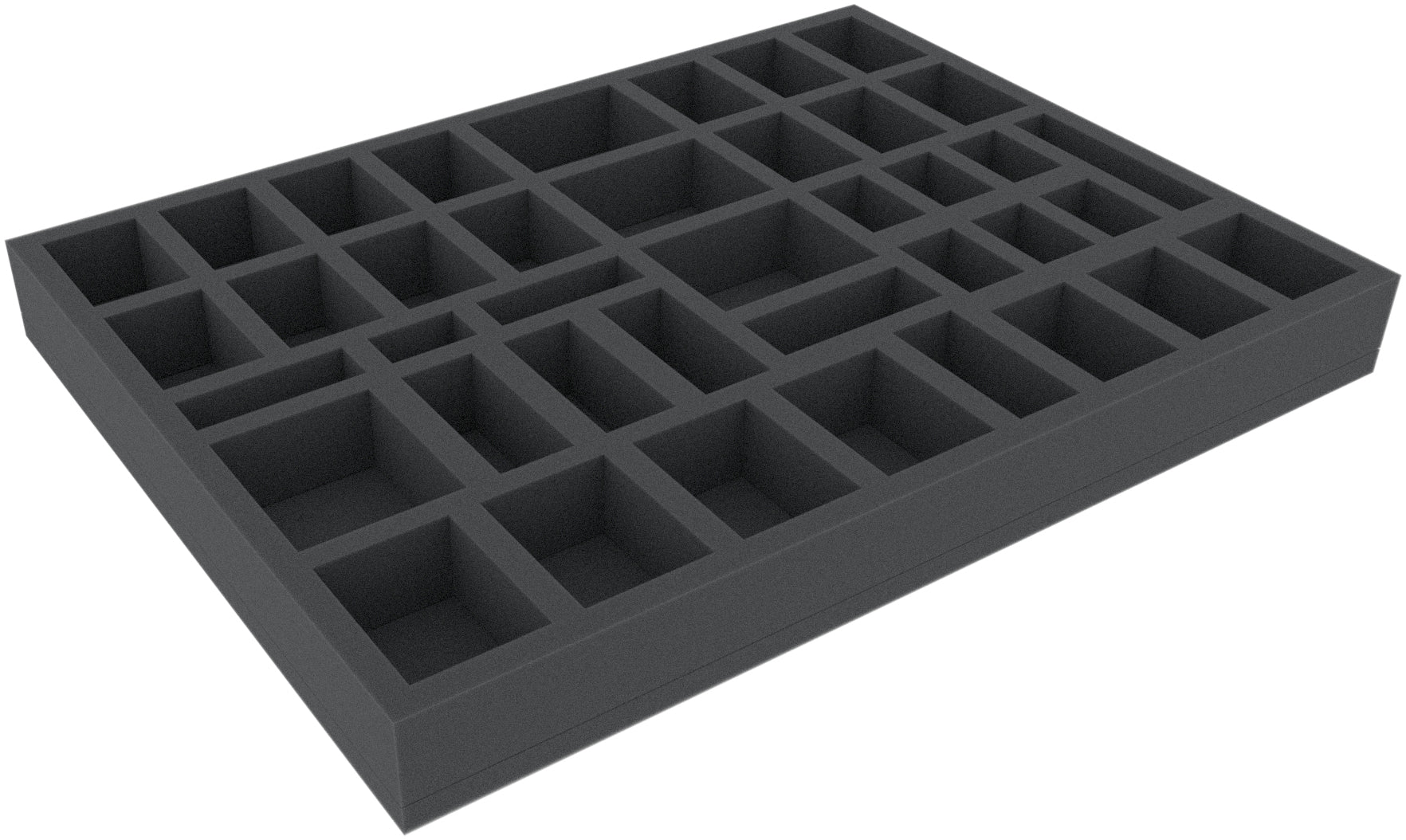 The foam tray has the following dimensions: 394 mm x 294 mm x 40 mm total height (30 mm usable height + 10 mm foam base).