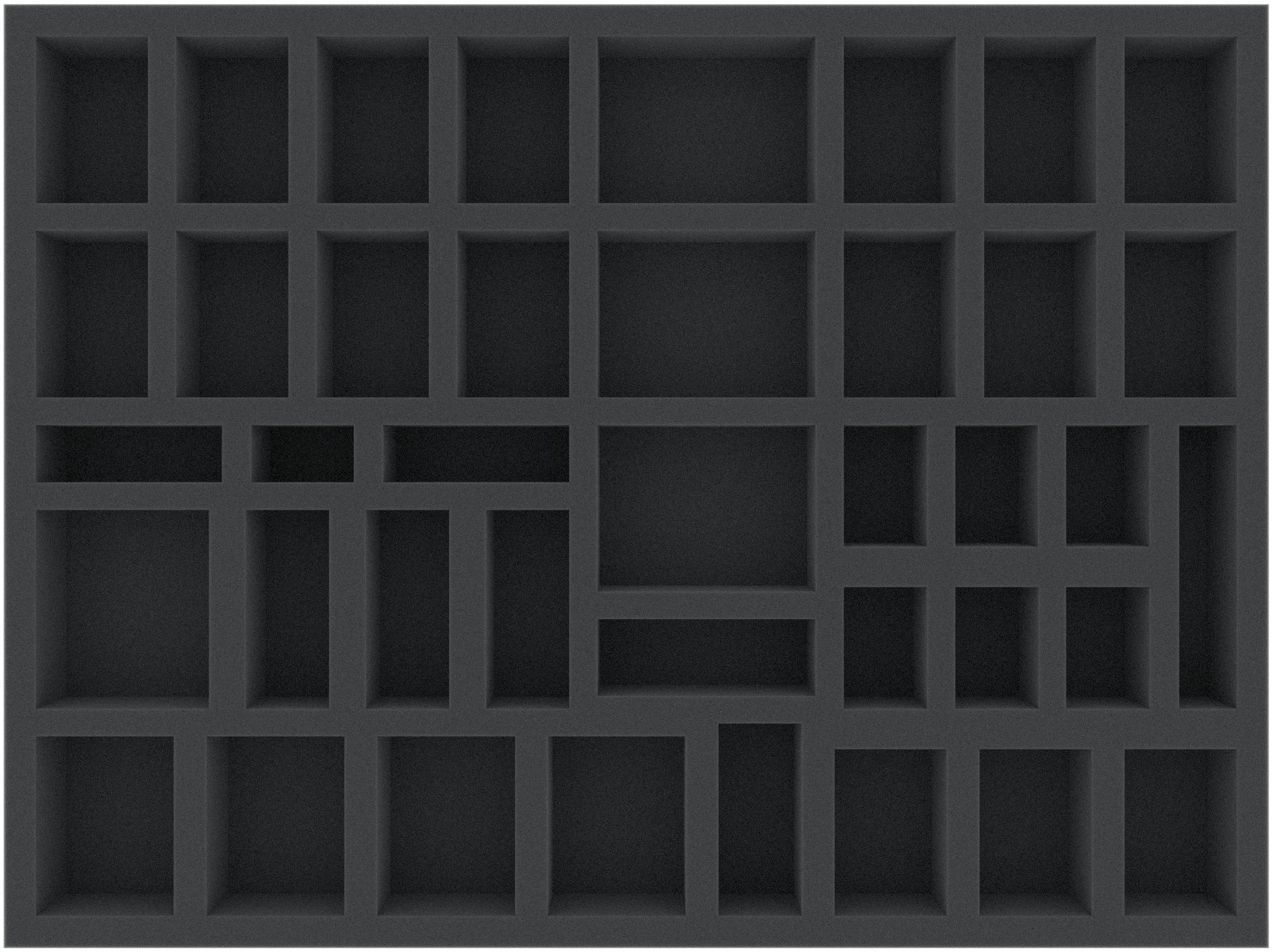 This 40 mm high foam tray is divided into 40 compartments. It is particularly suitable for the safe storage of tabletop and board game miniatures, as well as other fragile models and small parts.