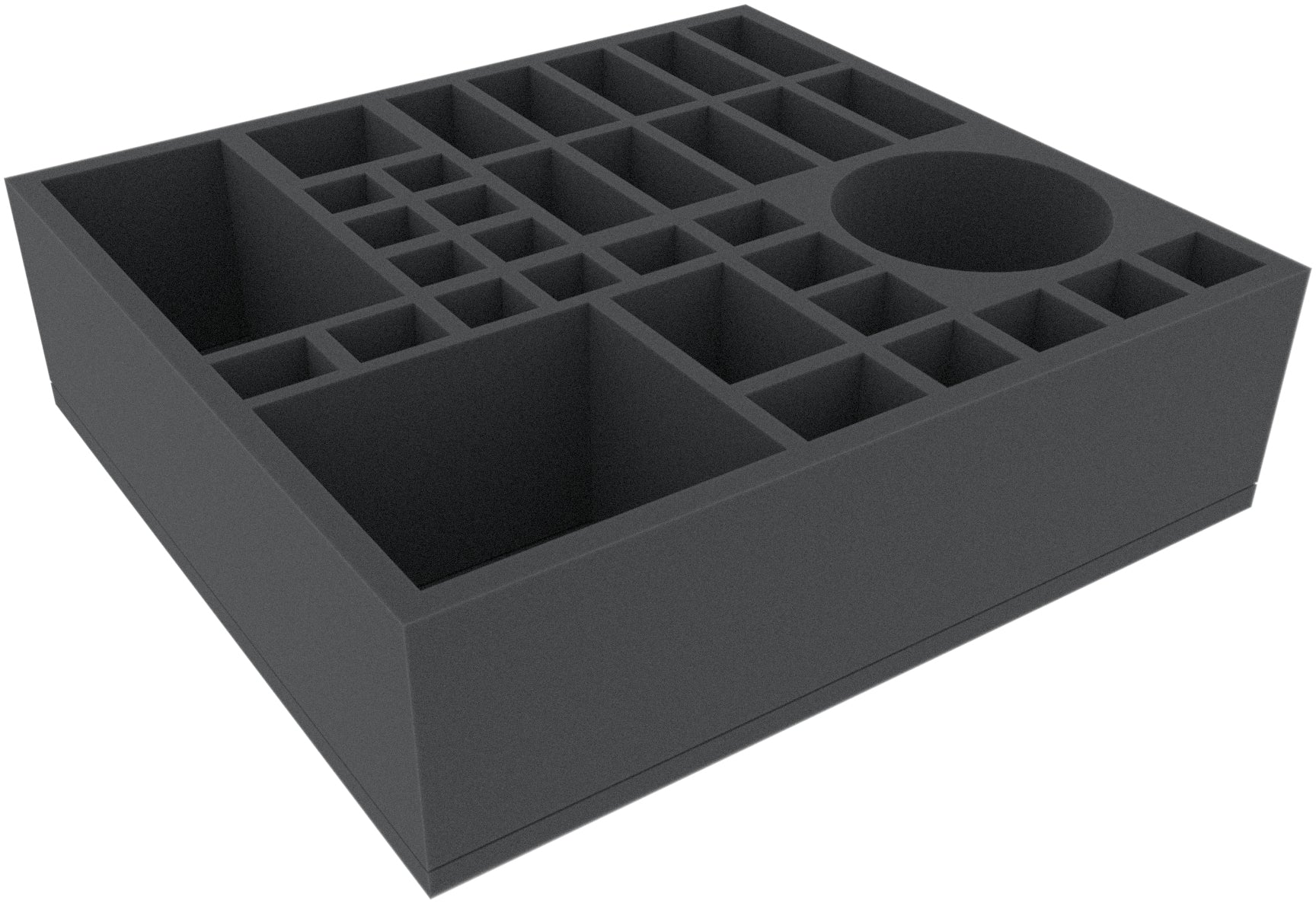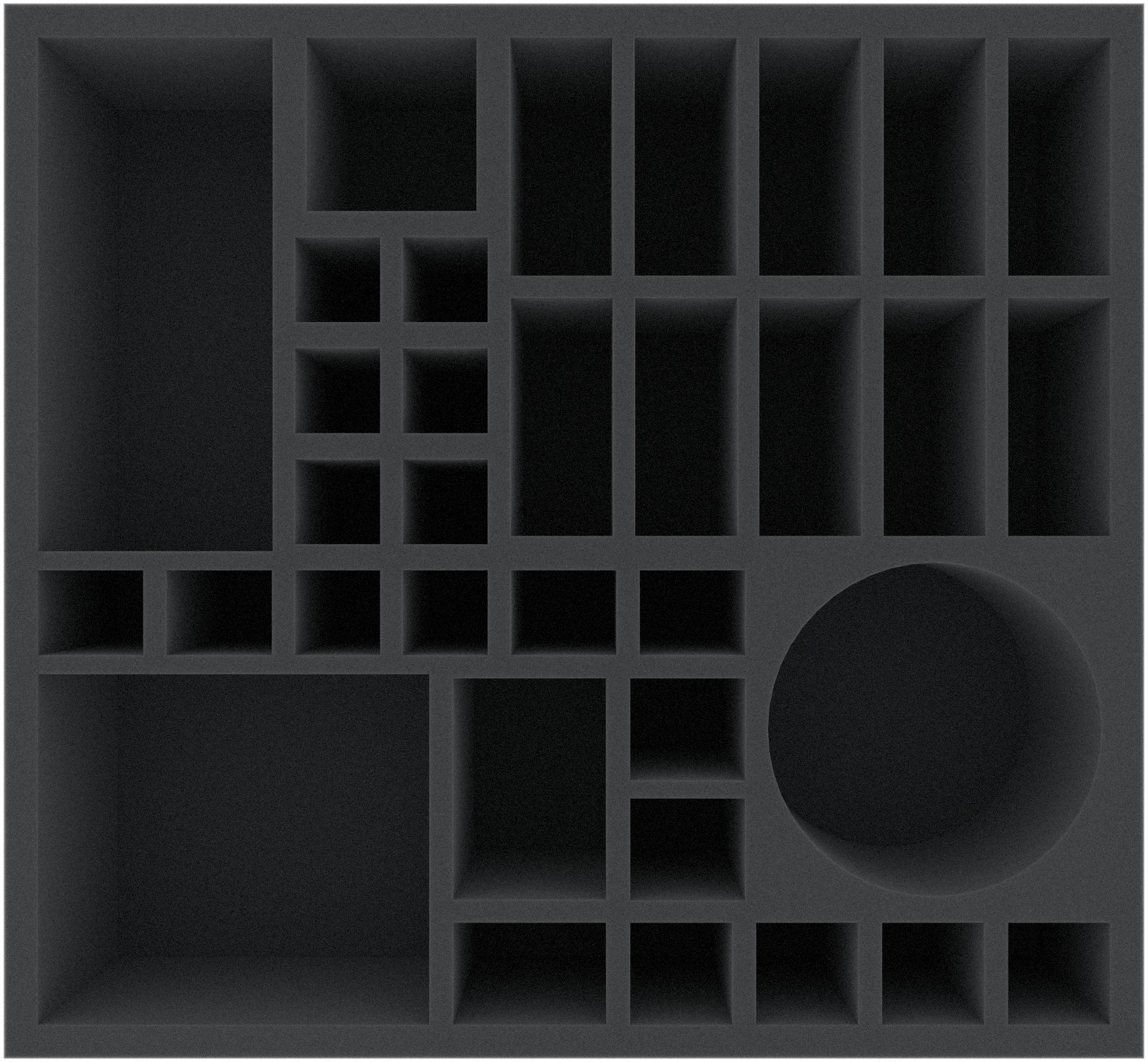 This 95 mm high foam tray is divided into 34 compartments. It is particularly suitable for the safe storage of tabletop and board game miniatures, as well as other fragile models and small parts.
