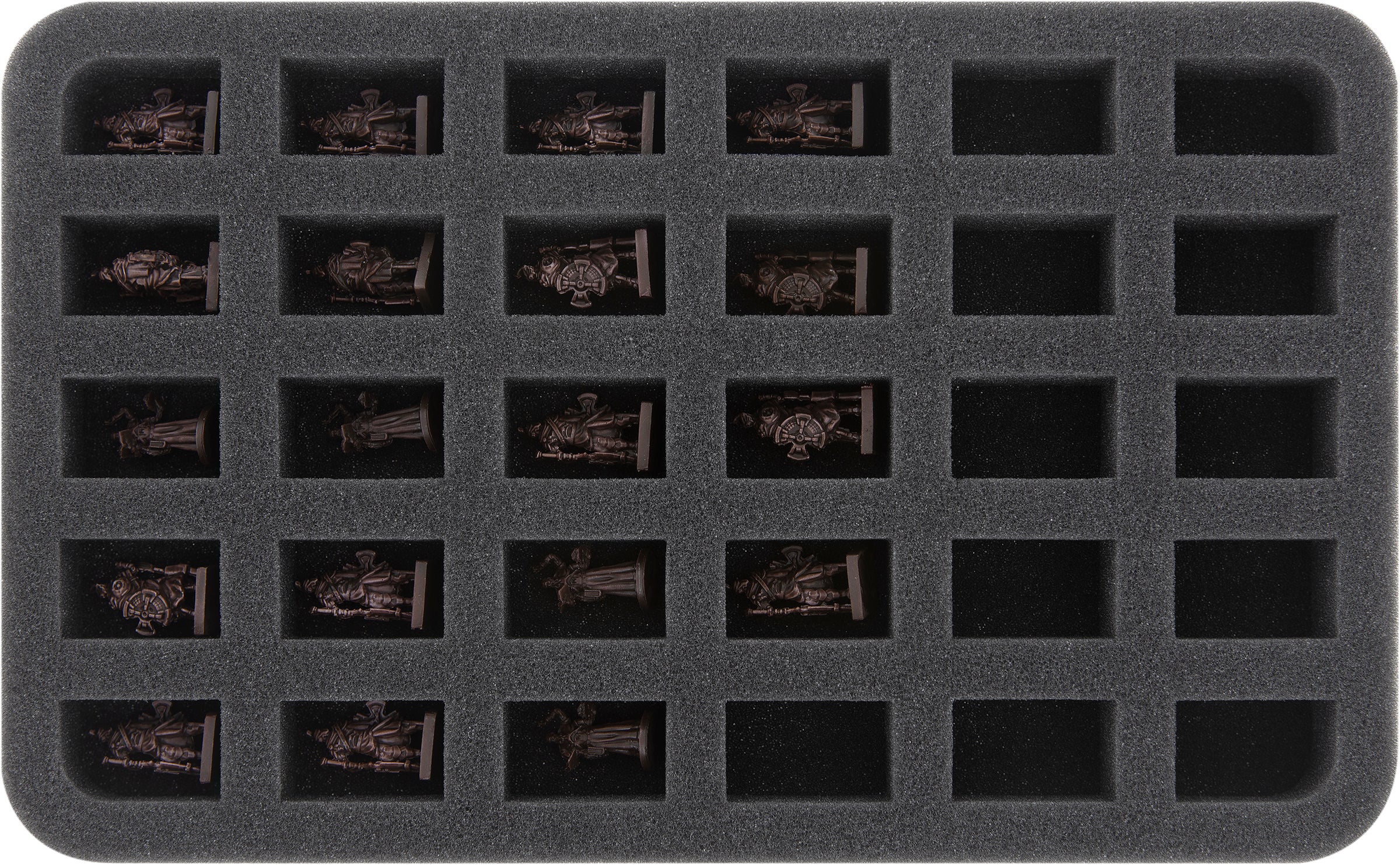 This Feldherr foam tray has 30 same-sized compartments for the clear and safe storage of wargaming miniatures in scale 1:100 (15 mm). The tray is thus ideally suited for miniatures of e. g. the games "Flames of War" or “Dropzone Commander".