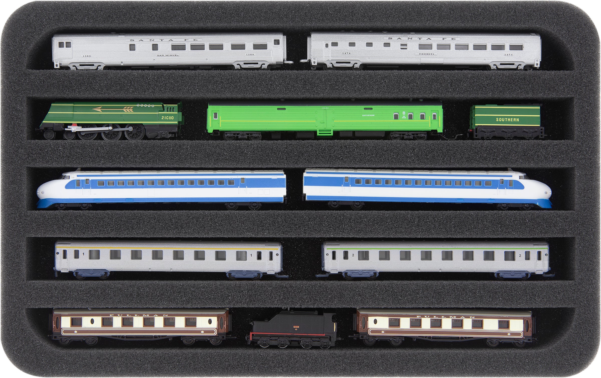 Five compartments, tailor-made for horizontal storage of model railways in Gauge Z, offer your wagons and locomotives reliable protection for storage and transport. Due to the lying position the tray can also be used as a display for the presentation of your model train collection.
