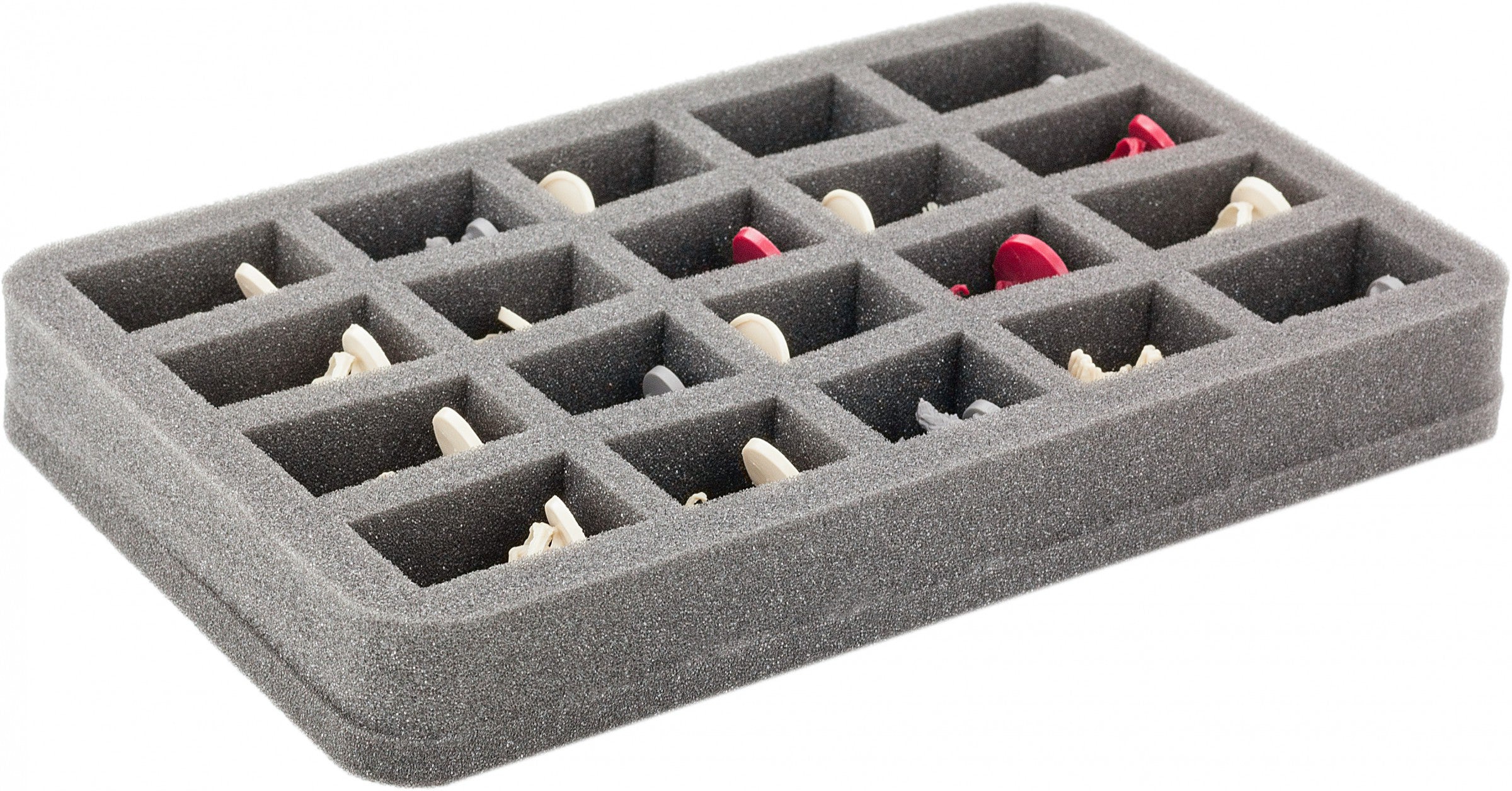 Esta estera consta de 20 compartimentos cónicos de diferentes tamaños. Se divide en ocho compartimentos con las dimensiones 49 mm x 30 mm, contiguos a otros ocho con las dimensiones 39 mm x 30 mm y 4 compartimentos ligeramente más pequeños en el centro con las dimensiones 37 mm x 30 mm. El diámetro de una base de miniaturas de Descent es generalmente de 25 mm. En consecuencia, hemos elegido la altura de la bandeja para que tus héroes y monstruos encuentren un lugar aquí en posición acostada. Las arañas de las cuevas, por otro lado, también caben en posición vertical. Esto le dará una rápida visión general de sus veinte miniaturas. La base de 10 mm de espesor suma la bandeja de espuma hasta una altura total de 35 mm.