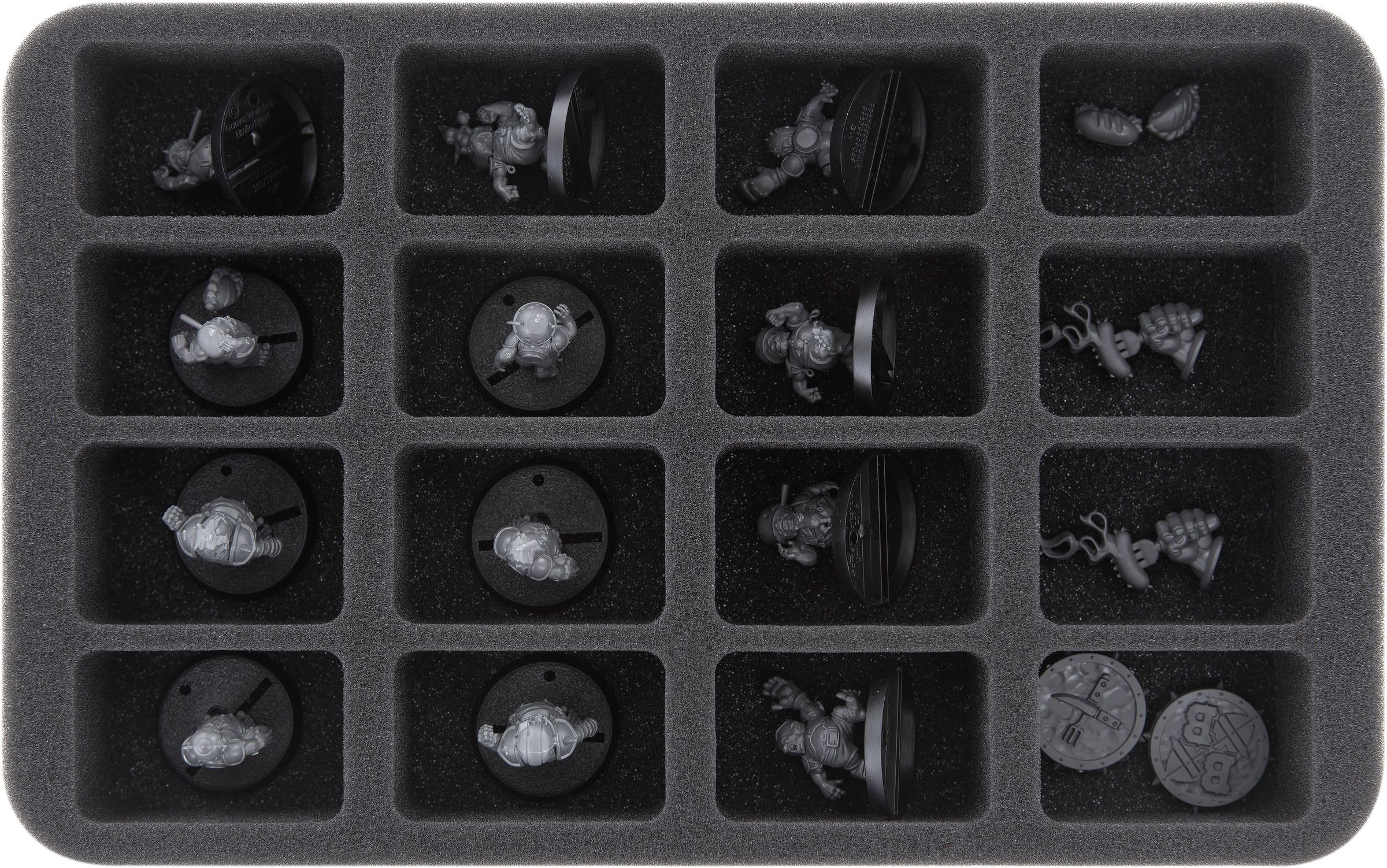 This Feldherr foam tray has 16 same-sized compartments for the clear and safe storage of wargaming miniatures in scale 1:56 (28 mm). The tray is thus ideally suited for miniatures of e. g. the games "Infinity The Game", "Warpath" or “Bolt Action".