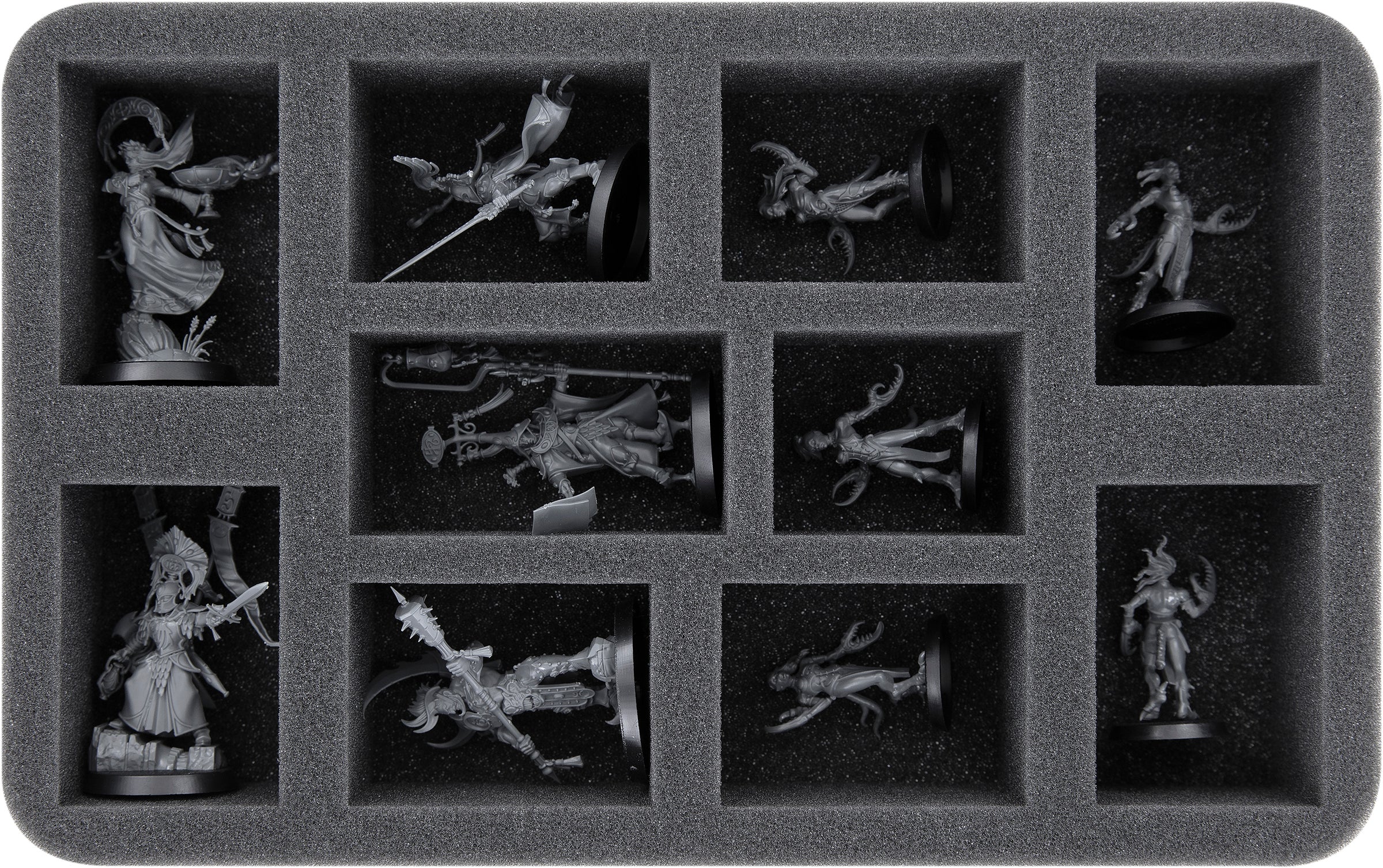 On this Feldherr foam tray you have space for up to 10 miniatures of your army. The insert is especially suitable for storing the Scinari Loreseeker, Scinari Calligrave, Scinari Cathallar and similar sized models.