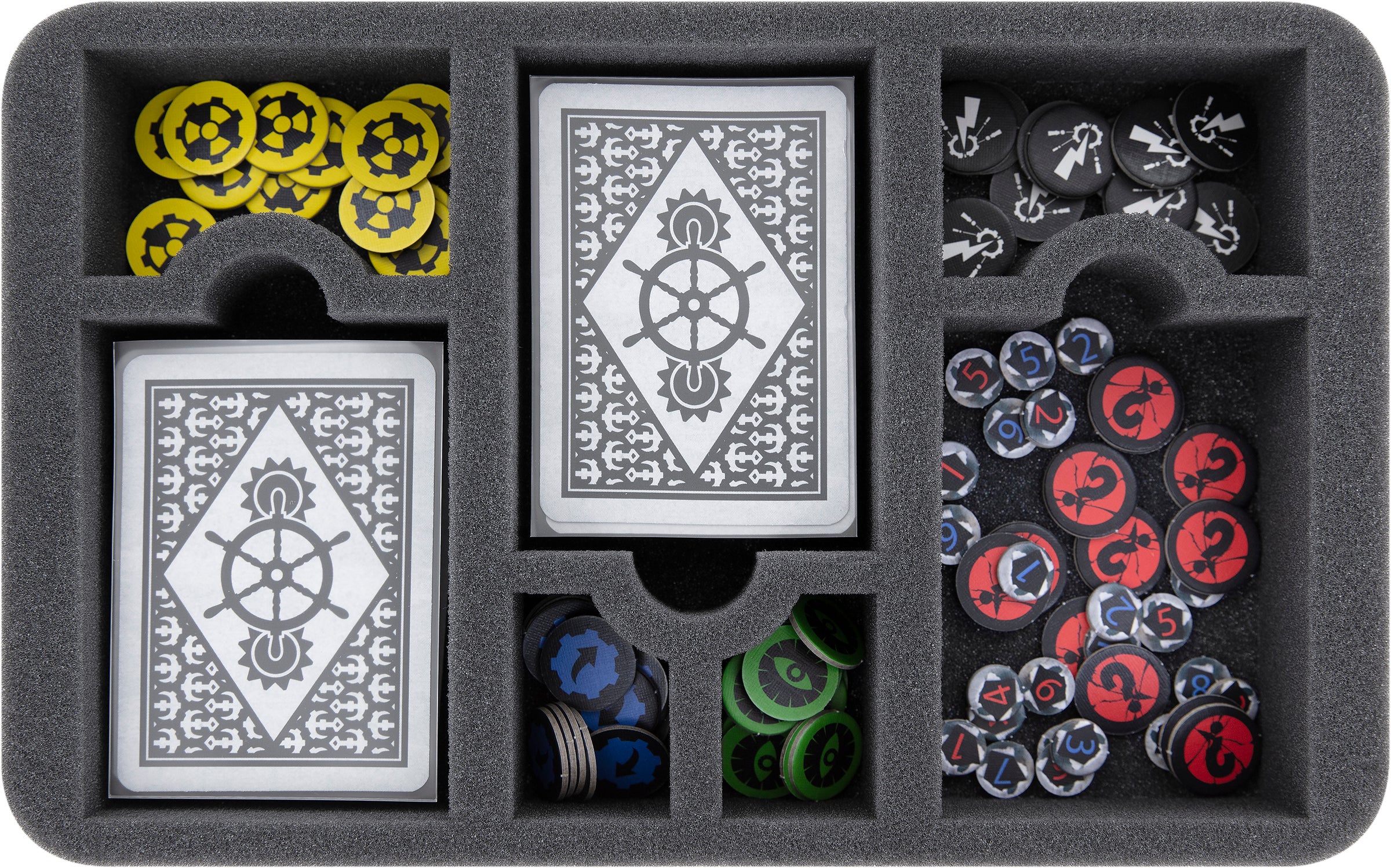 This Half-Size foam tray features 7 compartments of different sizes for your game material such as dice, cards, and tokens.