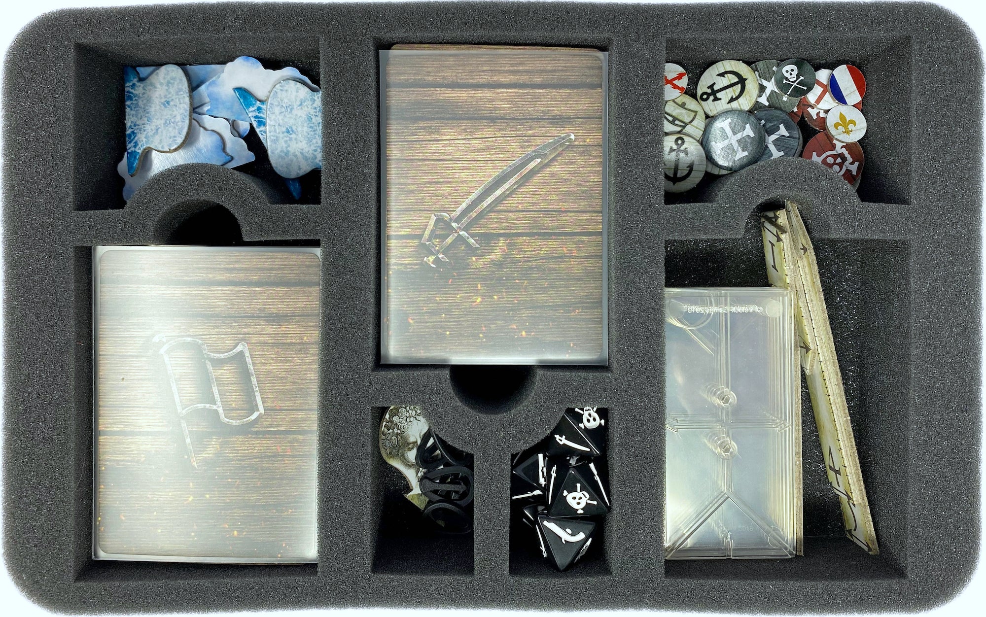 In order to coordinate your ships on the battlefield, you need a good command structure and the right tools to give orders. To keep your game material well sorted, this Feldherr Half-Size foam insert for „Oak and Iron“ is ideal to store your cards, clips, counter, dice and token.