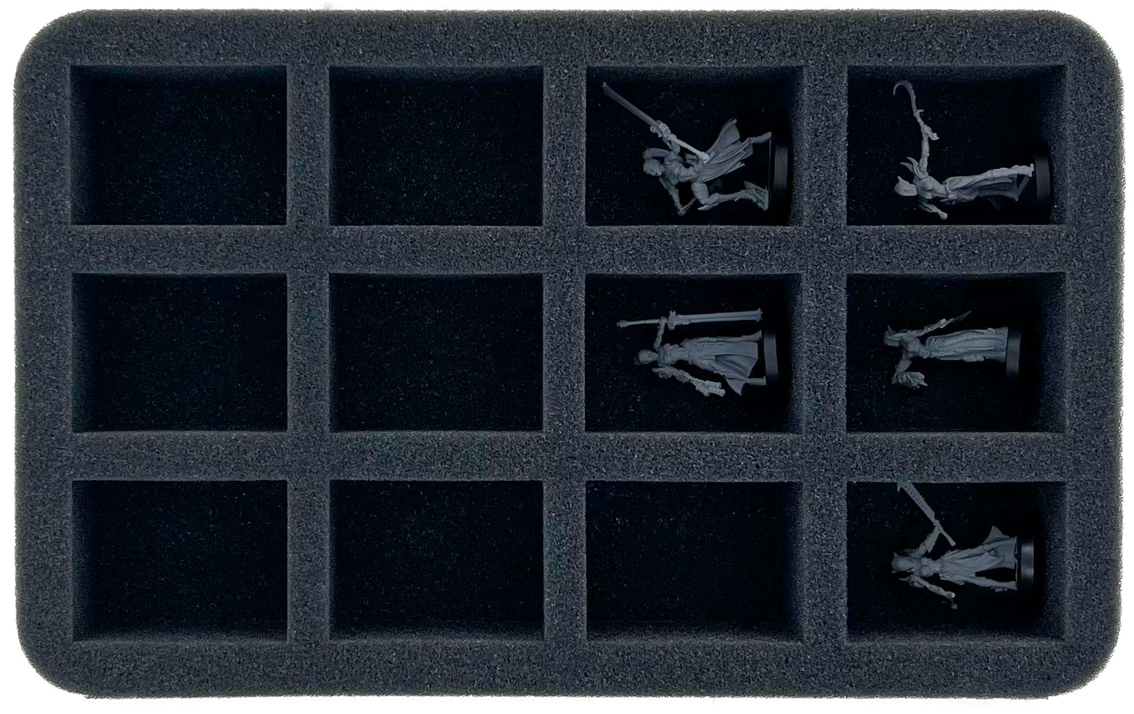 On this Half-Size foam tray you have space for up to 12 miniatures of your army. The insert is ideal for storing models on up to 40 mm bases