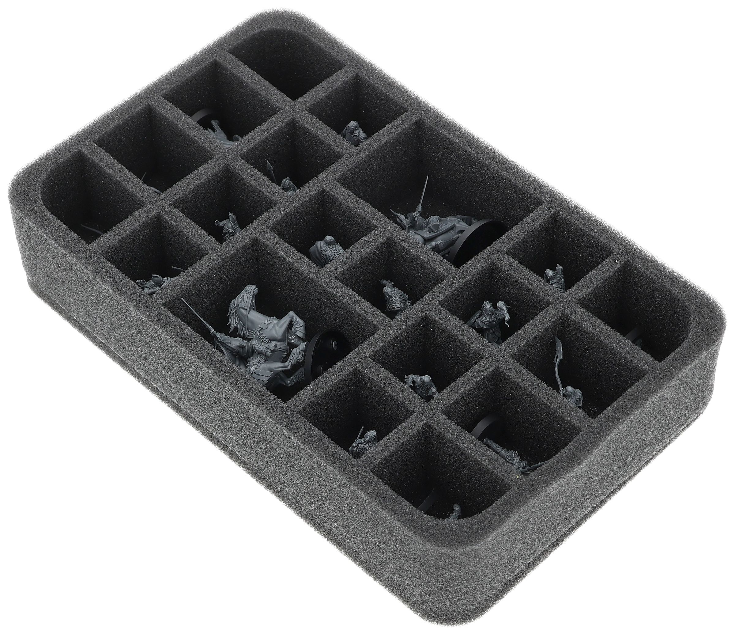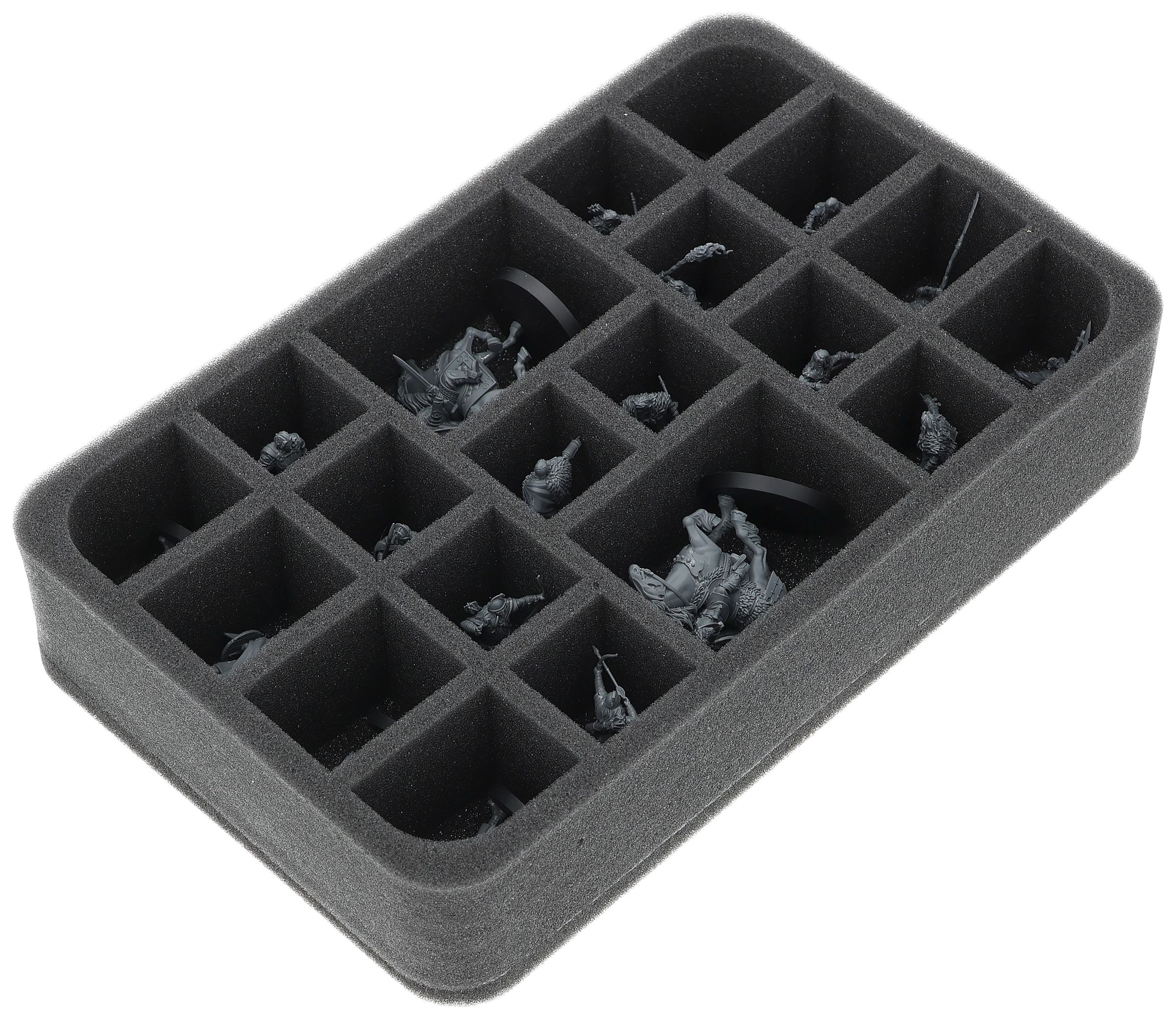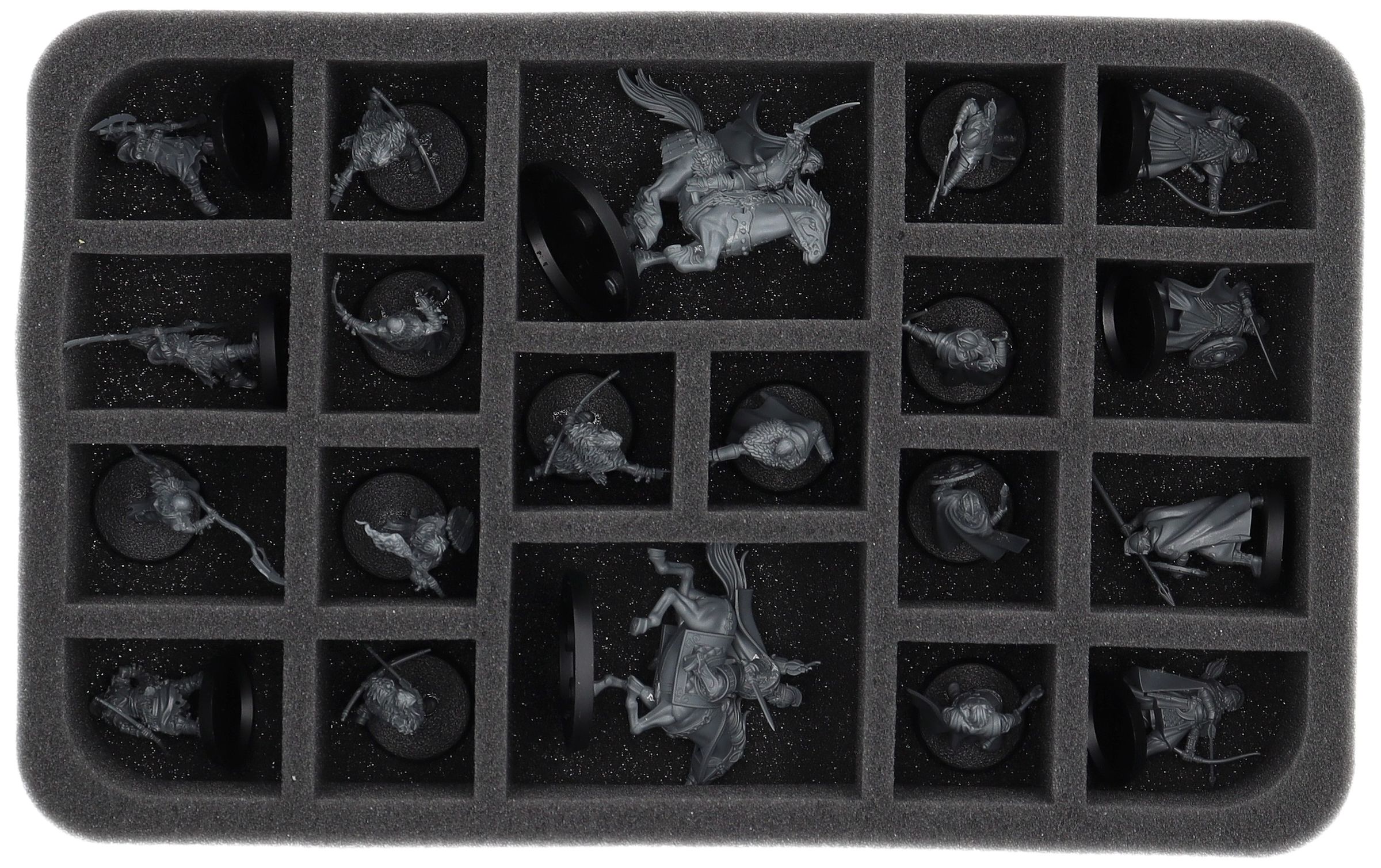 On this Feldherr foam tray you have space for up to 20 miniatures of your army. The insert is especially suitable for storing the Háma, Prince of Rohan mounted on a horse, General Targg mounted on a horse, Hill Tribesman, Warriors of Rohan and similar sized models.