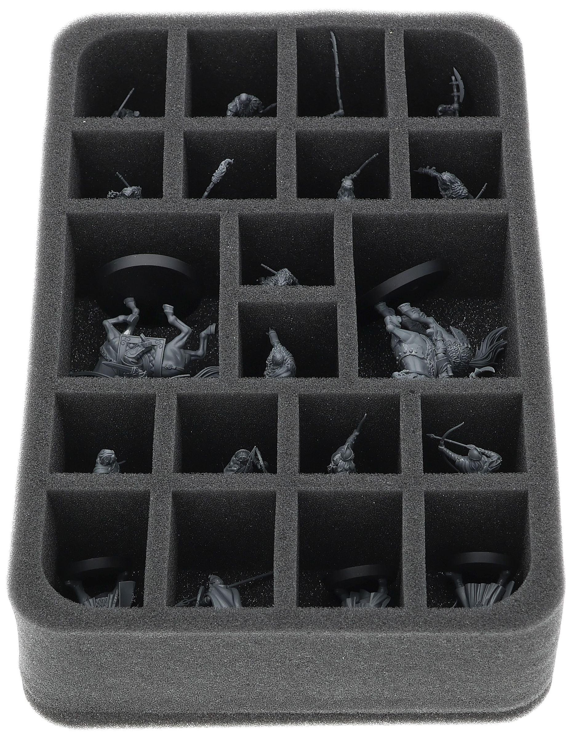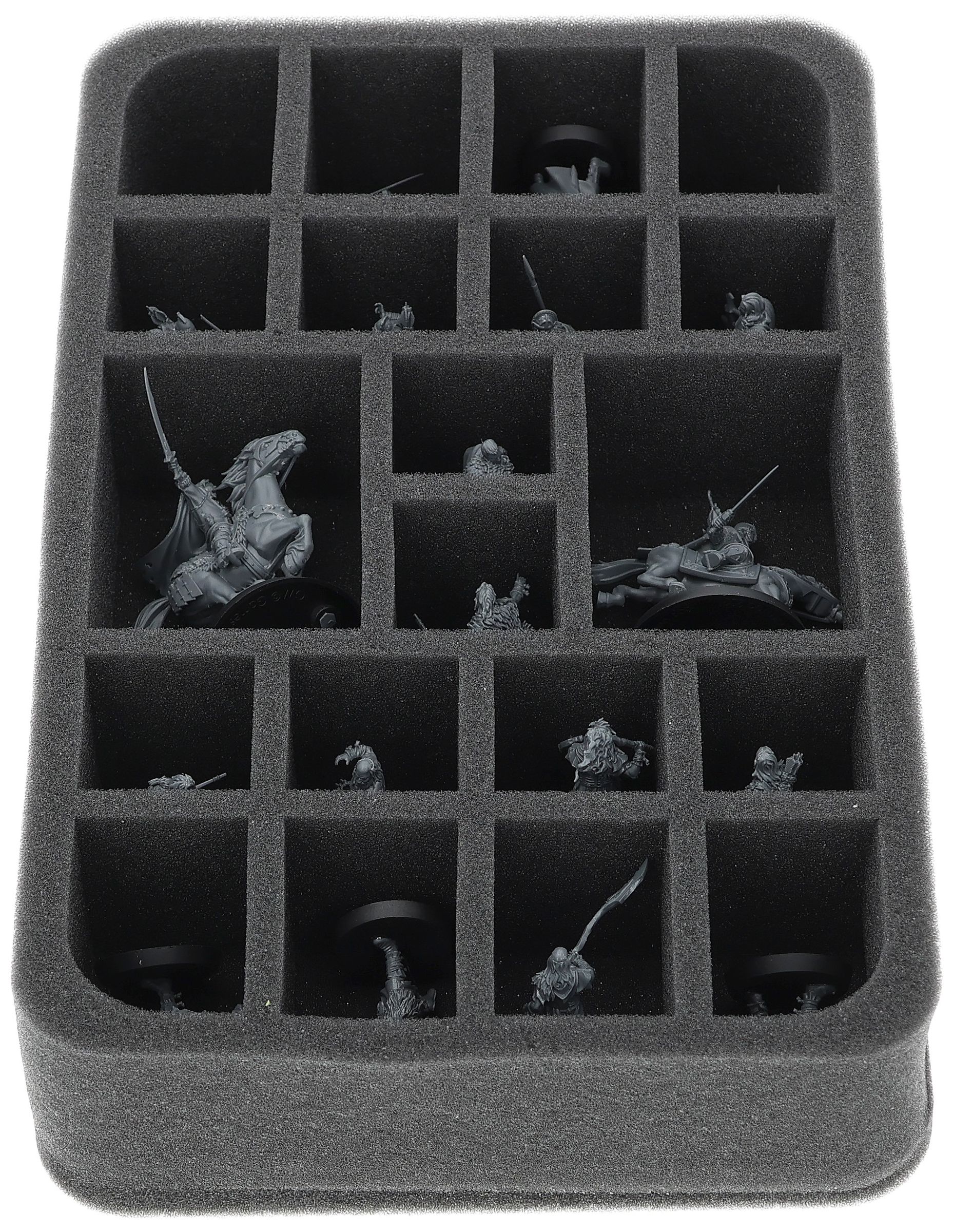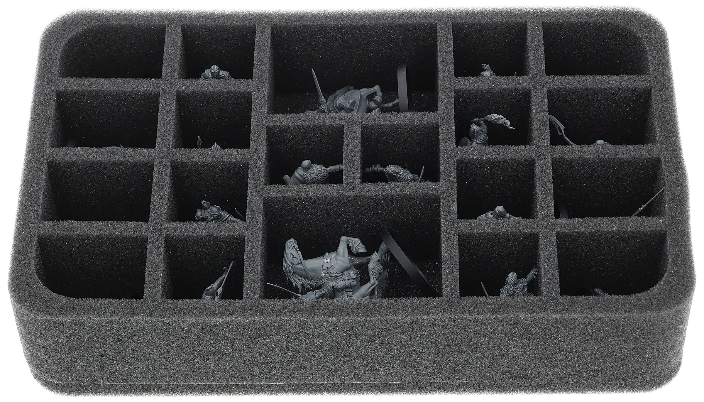 On this Feldherr foam tray you have space for up to 20 miniatures of your army. The insert is especially suitable for storing the Háma, Prince of Rohan mounted on a horse, General Targg mounted on a horse, Hill Tribesman, Warriors of Rohan and similar sized models.