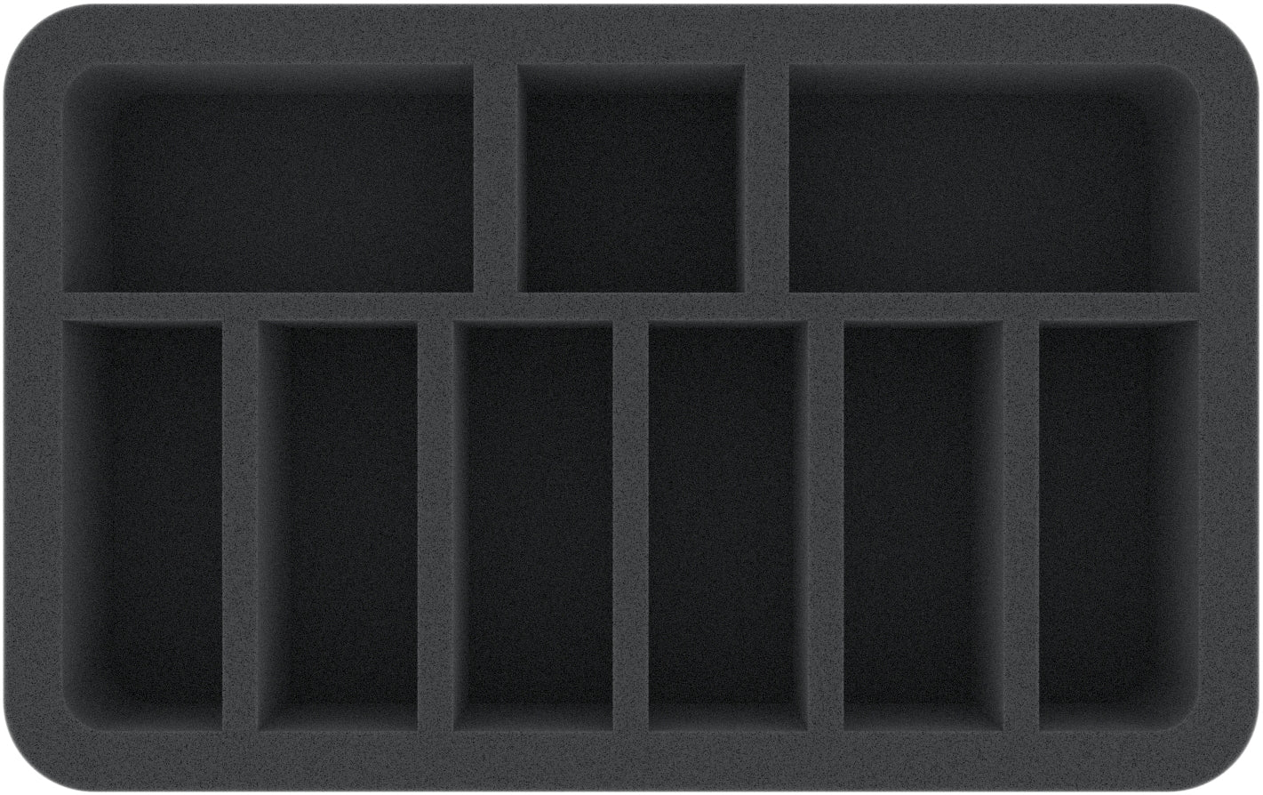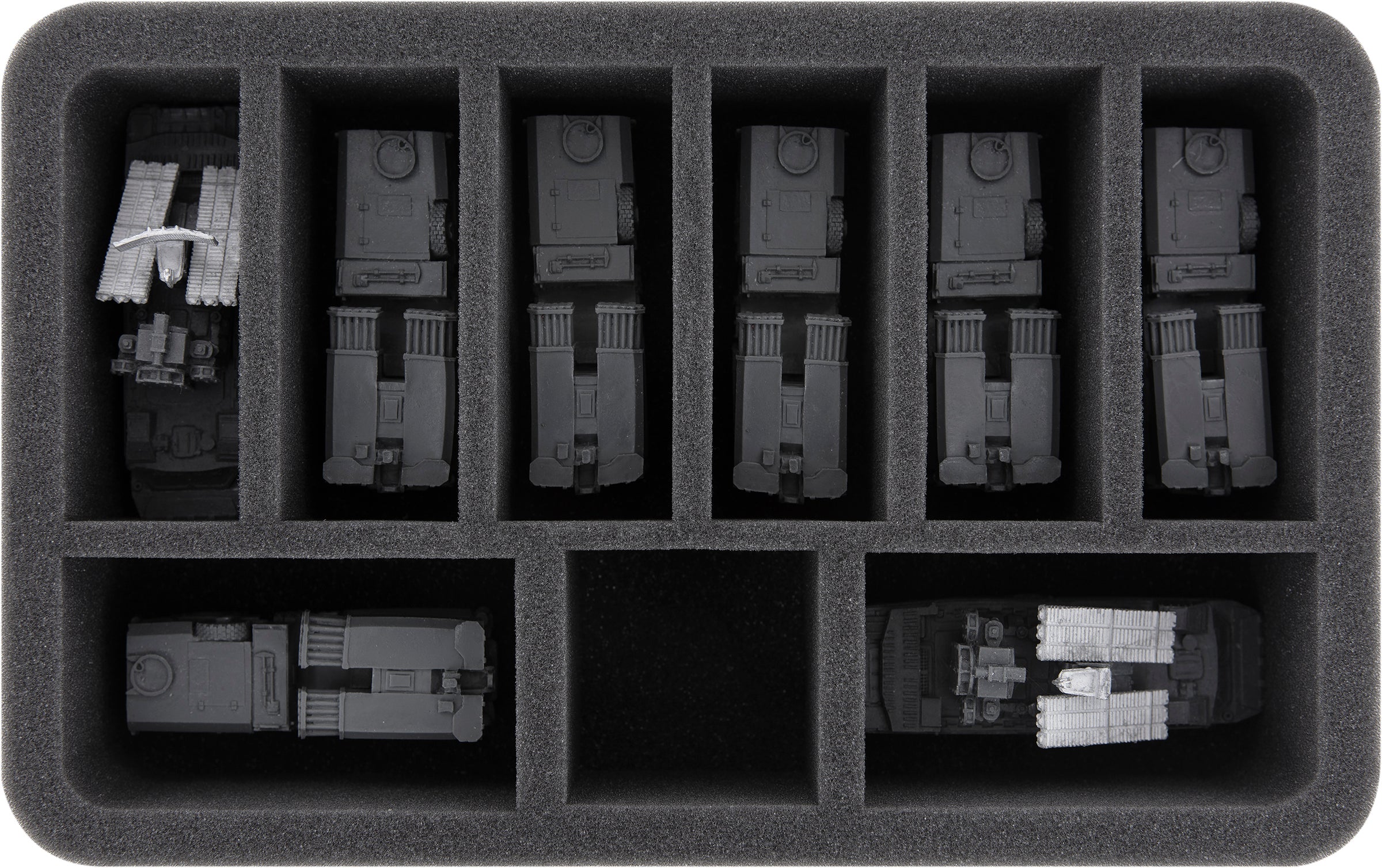 The 9 different sized compartments on this Half-Size foam tray are especially suitable for the neat storage of longish vehicle models for Flames of War and Team Yankee.