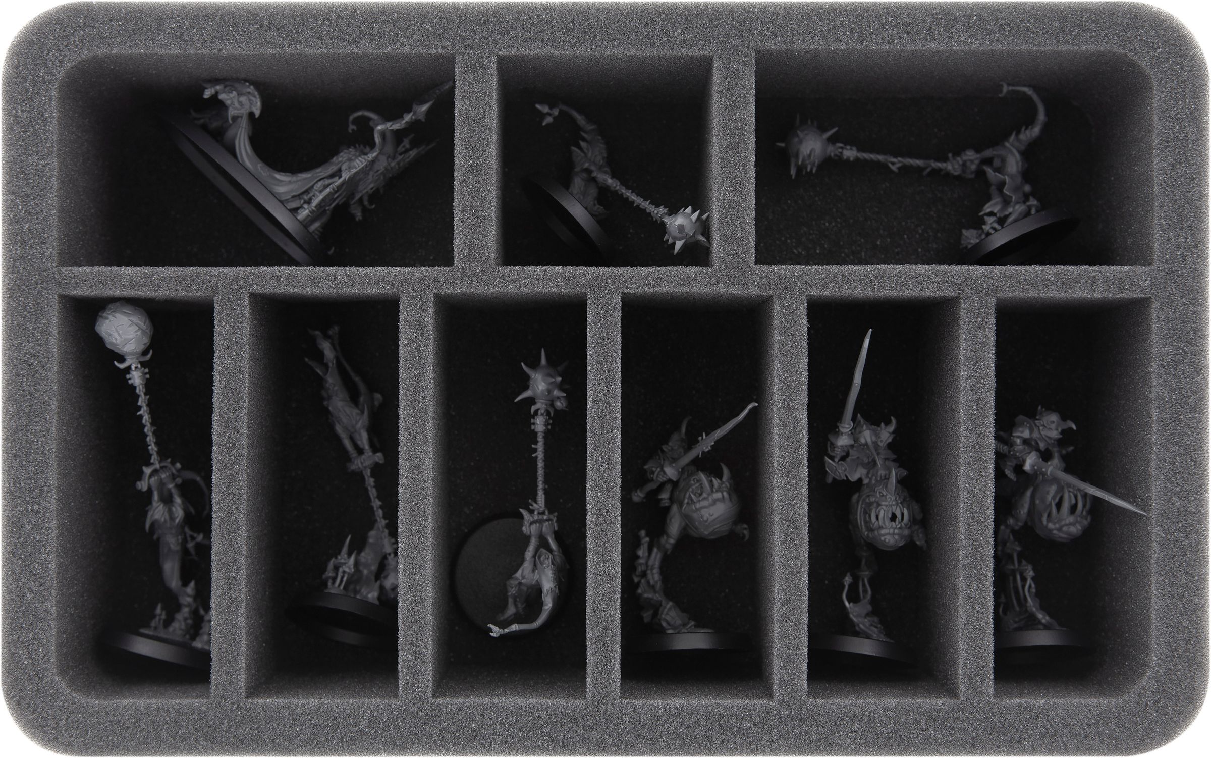 This Half-Size foam insert is divided into 9 compartments with 3 different sizes. It is ideal to clearly and safely store elongated models of the Gloomspite Gitz.