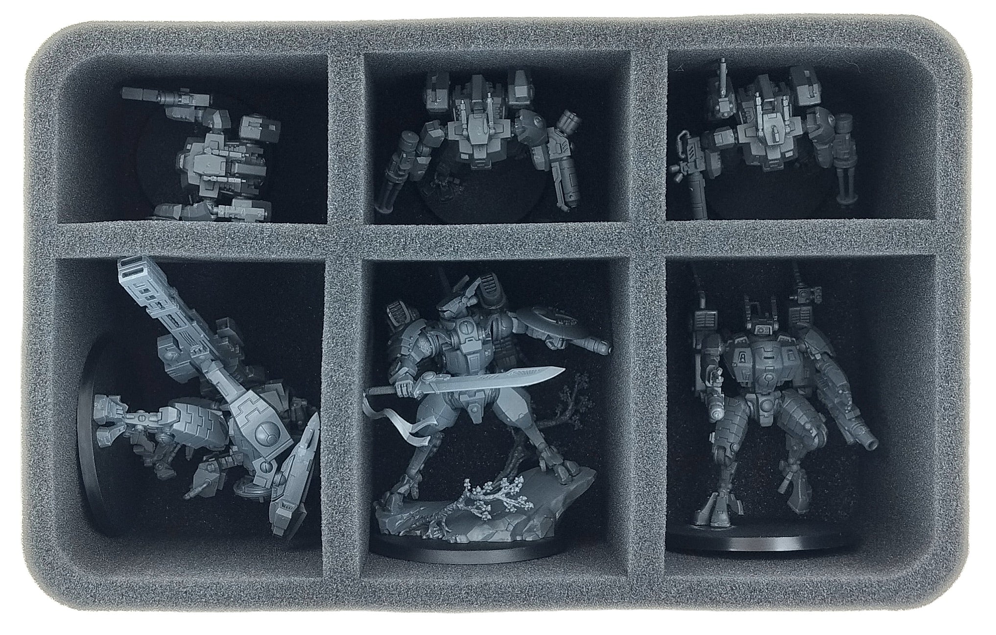 This Feldherr foam tray provides space for up to 6 miniatures from your army. The insert is particularly suitable for storing models like Commander Farsight, XV88 Broadside Battlesuits, XV8 Crisis Battlesuits, and models with similar dimensions.