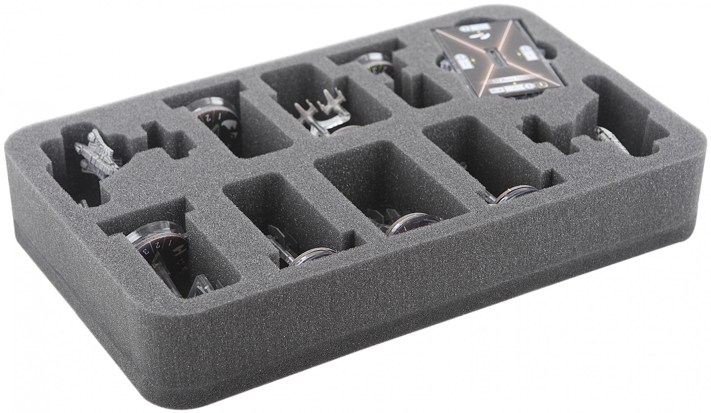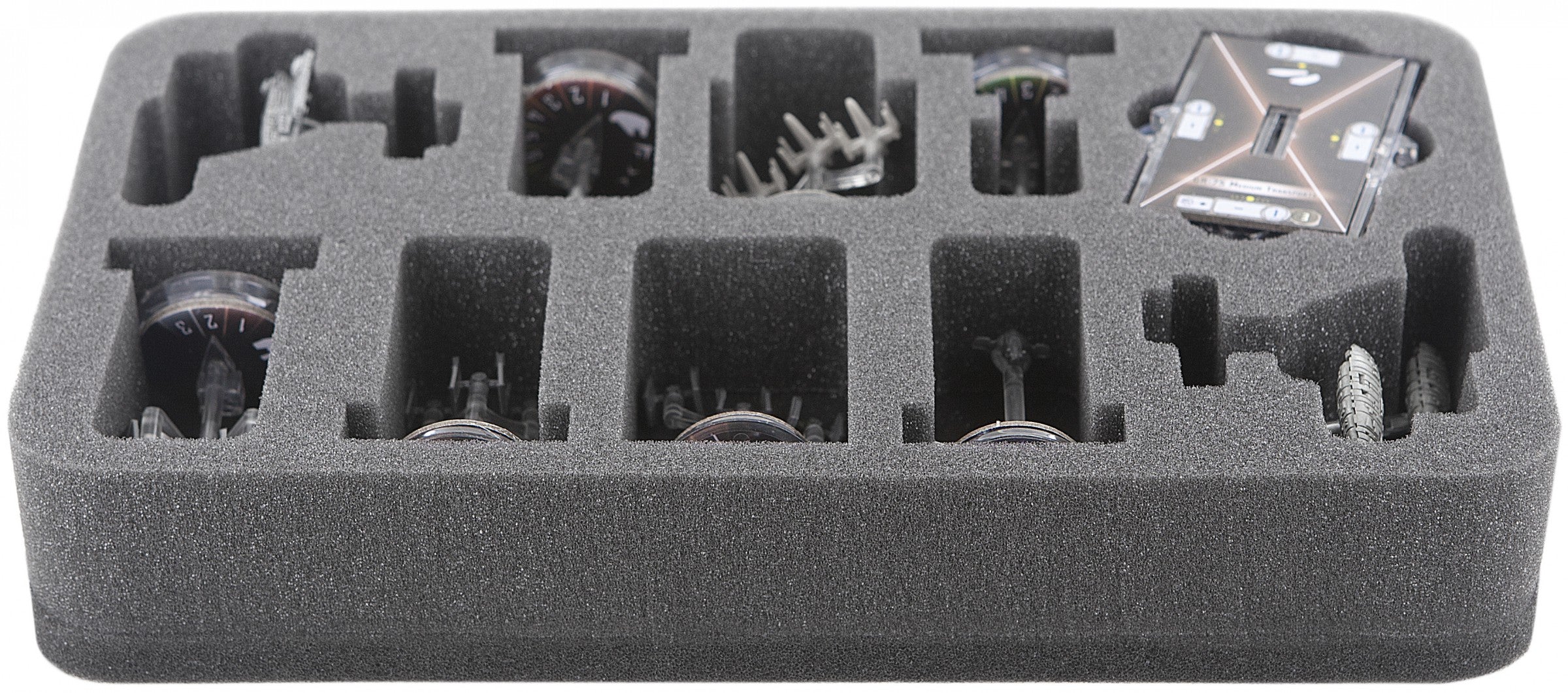 Especially for the Star Wars Armada Wave III foam tray. There is enough space to store two Imperial Assault Carriers (Gozanti) and / or Rebel Transports Flotillas (compartments can also be used for Wave 2 Imperial Raider and / or Wave 1 CR90 Tantive!). In addition, there is enough space for 2 bases, standard size, Star Wars Armada Star Ships with base, Command and Speed Dials