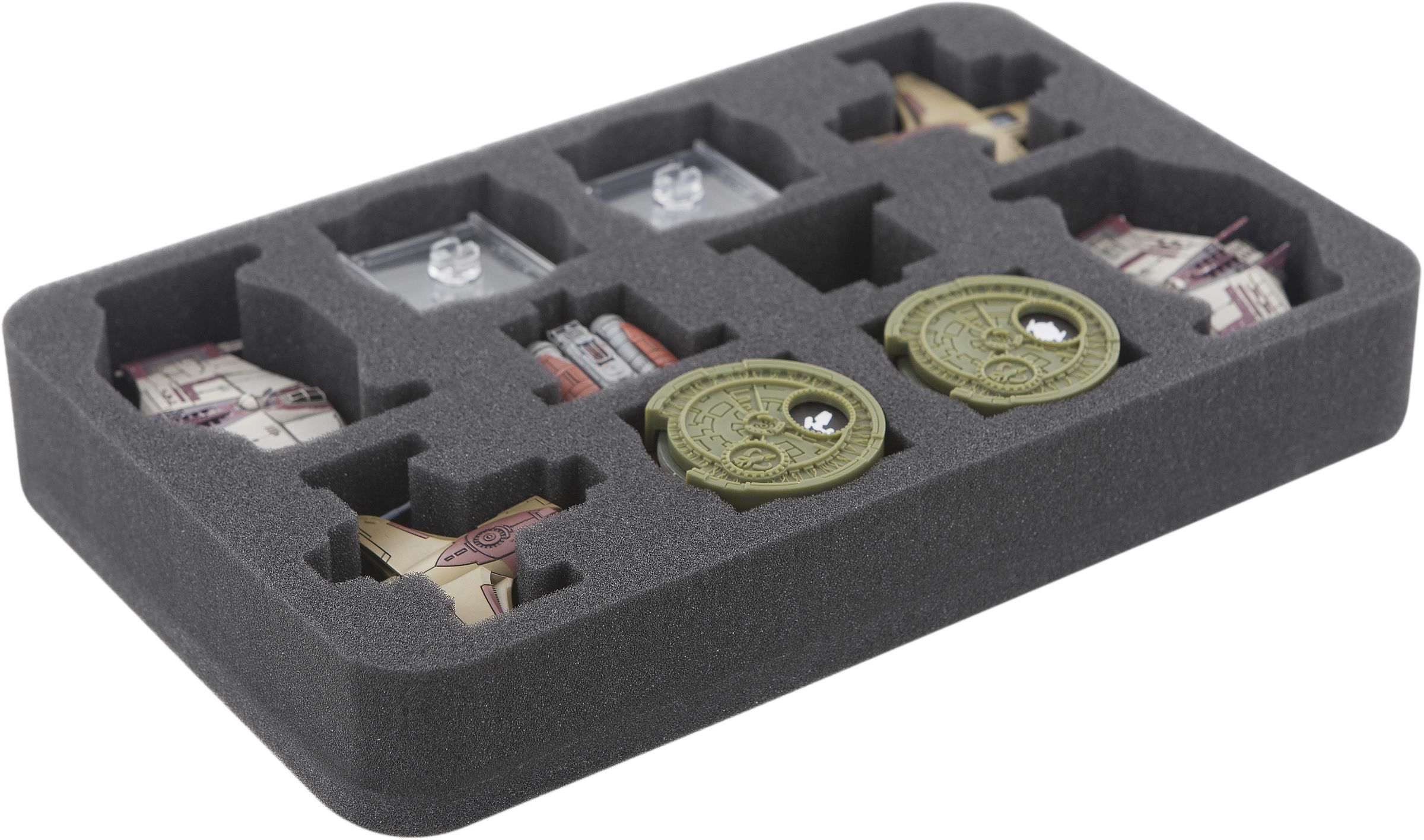 With this foam tray you can protect your Scum fleet of M12-L Kimogila Fighter, Quadjumper and H-6 Scurrg Bomber. For each ship you have two compartments with a special designed shape. So your ships fit in the foam perfectly. In the foam tray you have additional space for six Dials and six Bases.