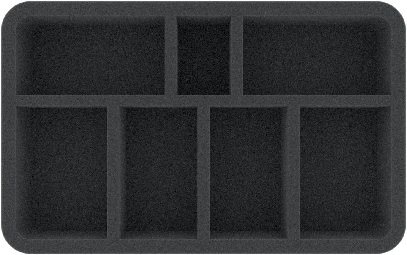 This 55 mm mm high foam tray is divided into 7 compartments. It is particularly suitable for the safe storage of tabletop and board game miniatures, as well as other fragile models and small parts.