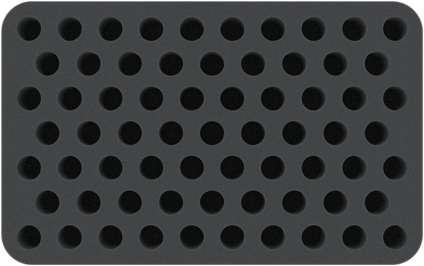This 35 mm high foam tray is divided into 67 round compartments. It is particularly suitable for the orderly storage and safe transport of fragile models and small items.