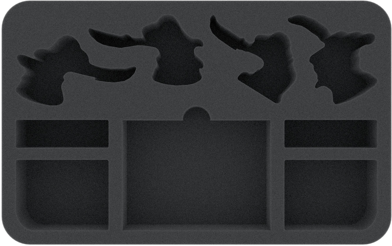 The custom-cut Half-Size foam tray offers a total of 9 compartments for stowing the Glaivewraith Stalker miniatures and related game materials from the Starter Set. Miniature-precisely shaped compartments provide a safe retreat for Viceroy Drepur, Grodrug the Lance, Sire Haqfel and the Patrician.