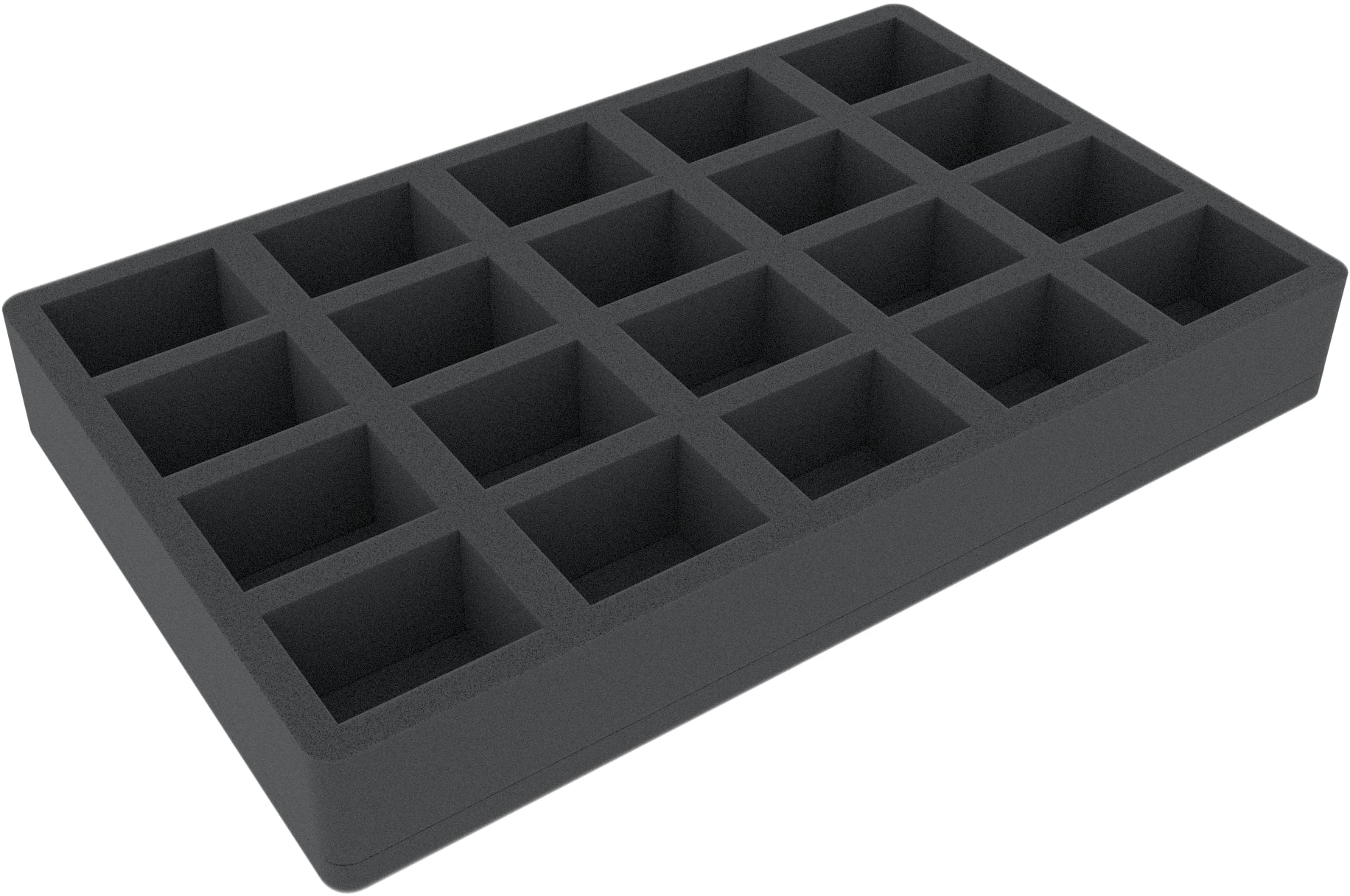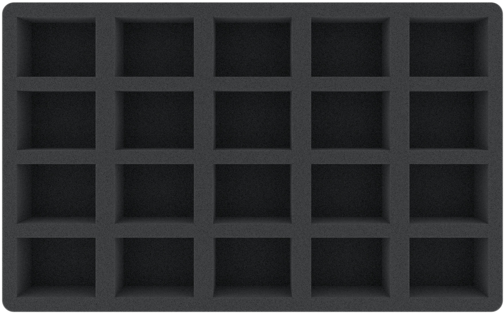 This 45 mm tall foam tray is divided into 20 compartments. It is particularly suitable for the safe storage of tabletop and board game miniatures, as well as other fragile models and small parts.