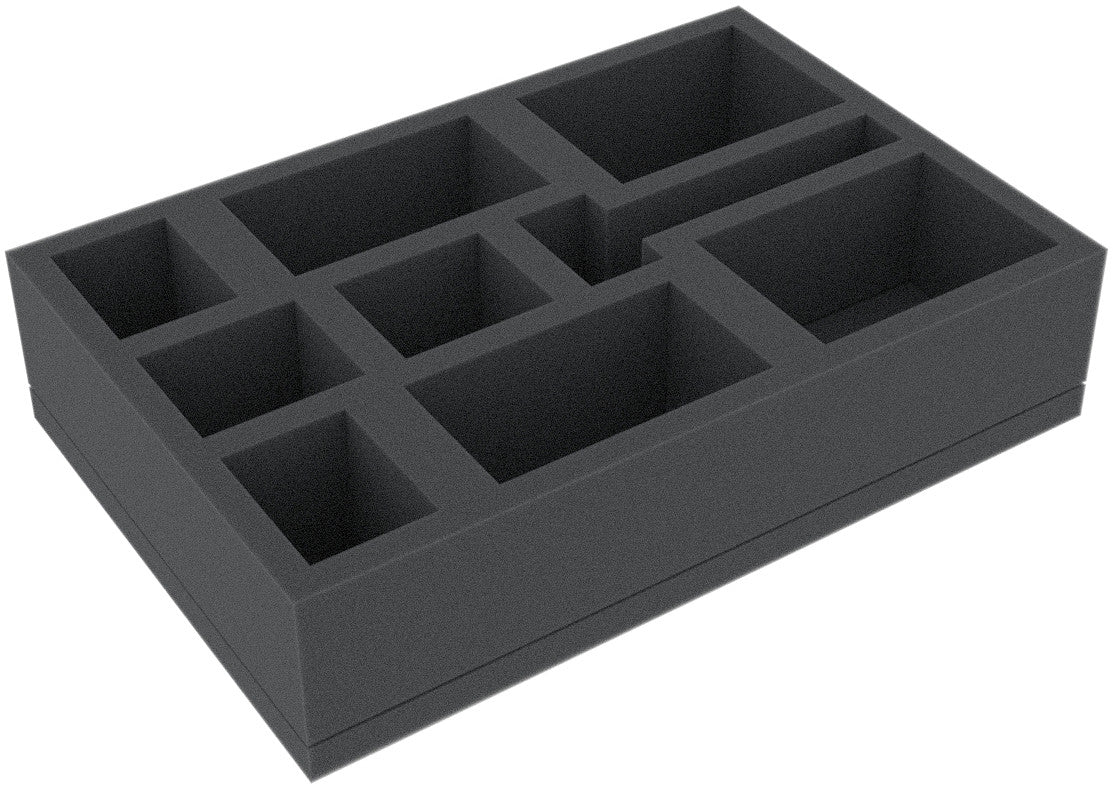 This 50 mm high foam tray is divided into 9 compartments. It is particularly suitable for the safe storage of tabletop and board game miniatures, as well as other fragile models and small parts.