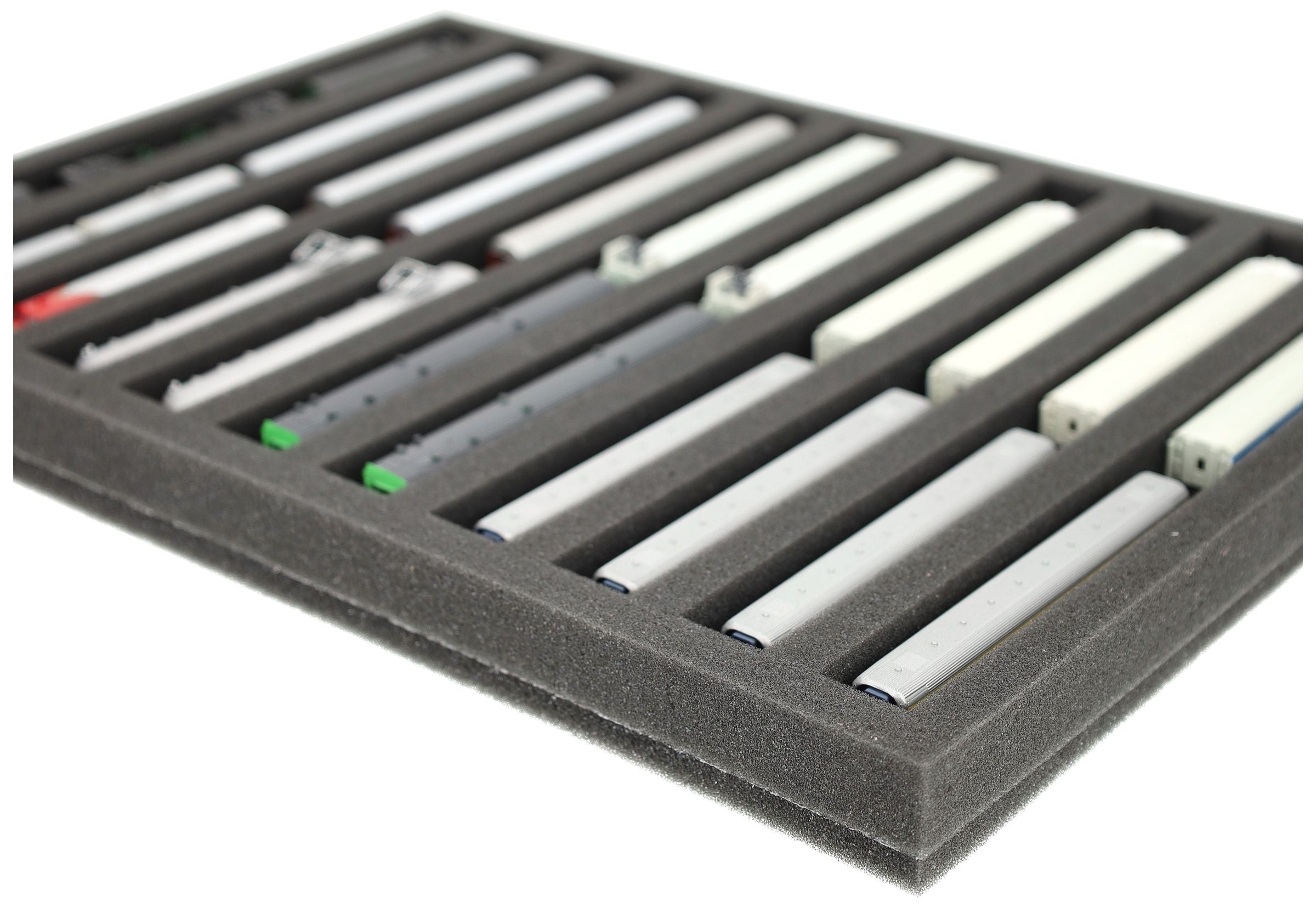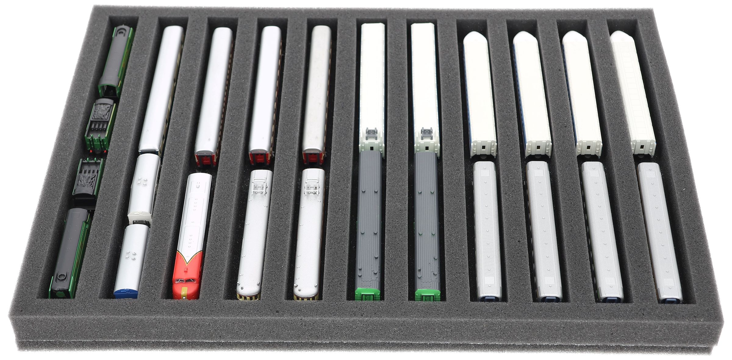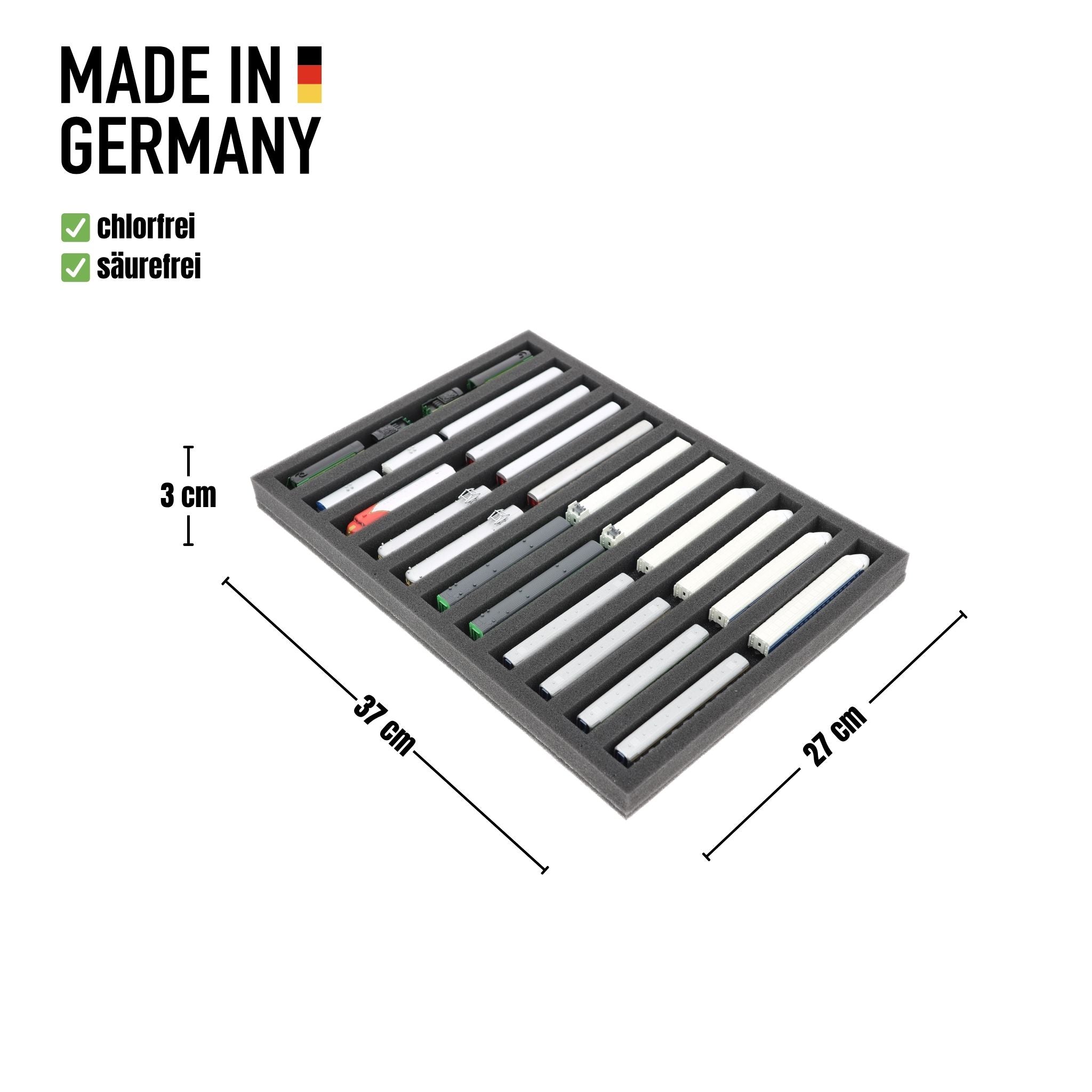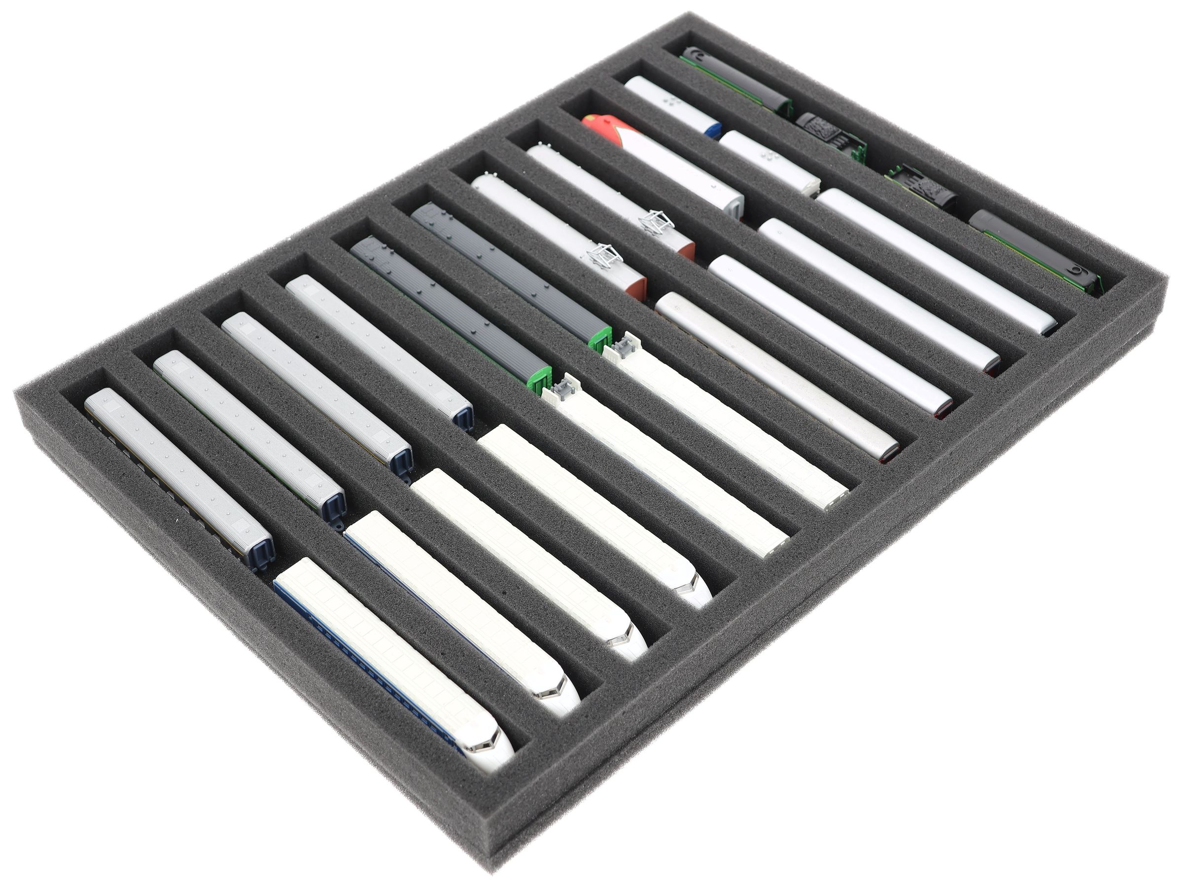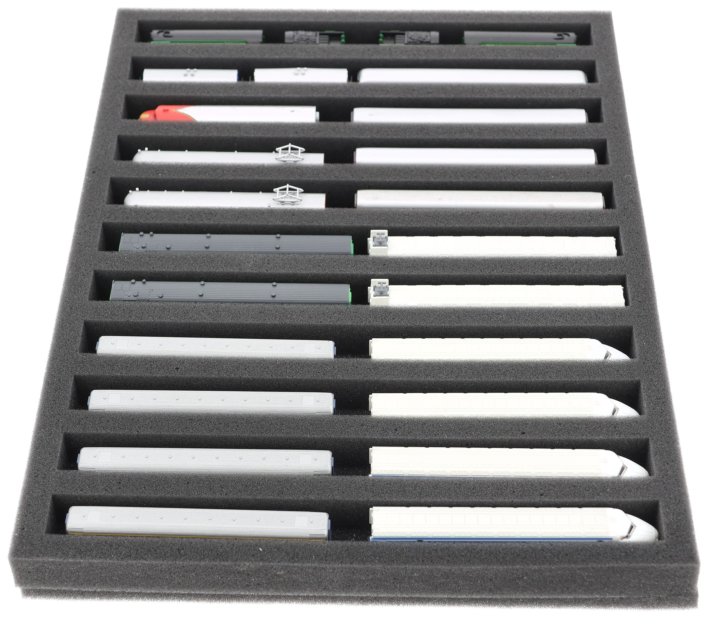 Whether for transport to exhibitions, module meetings, or space-saving storage on shelves at home, this insert keeps your Z scale locomotives and cars reliably protected. The 11 compartments hold the models horizontally and shield them from bumps and scratches.
