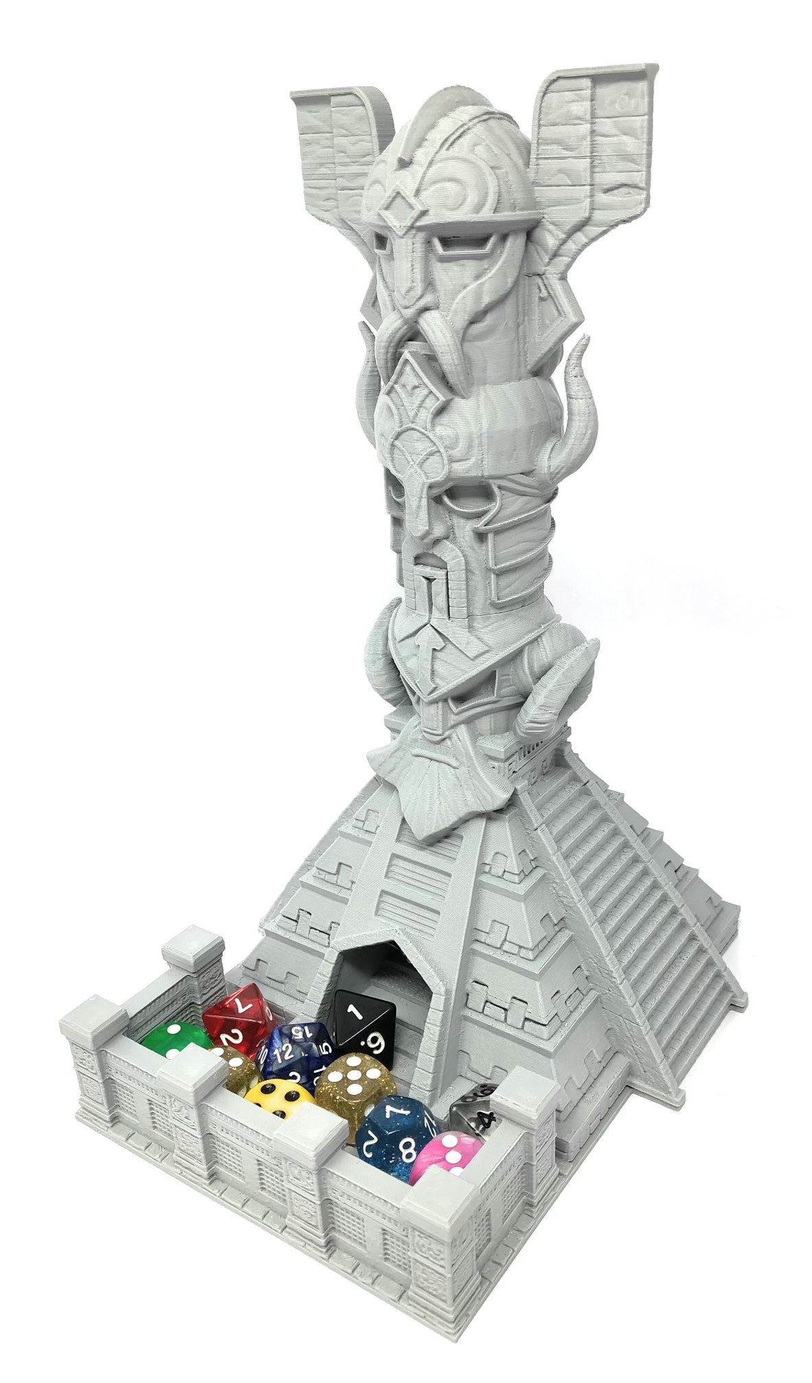 3D printed - detailed dice tower, with removable roof and exchangeable dice tray. The Dice Tower can also be used as a terrain part for your miniatures game or as a center piece for your next DnD session.