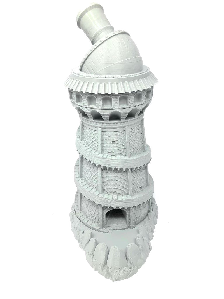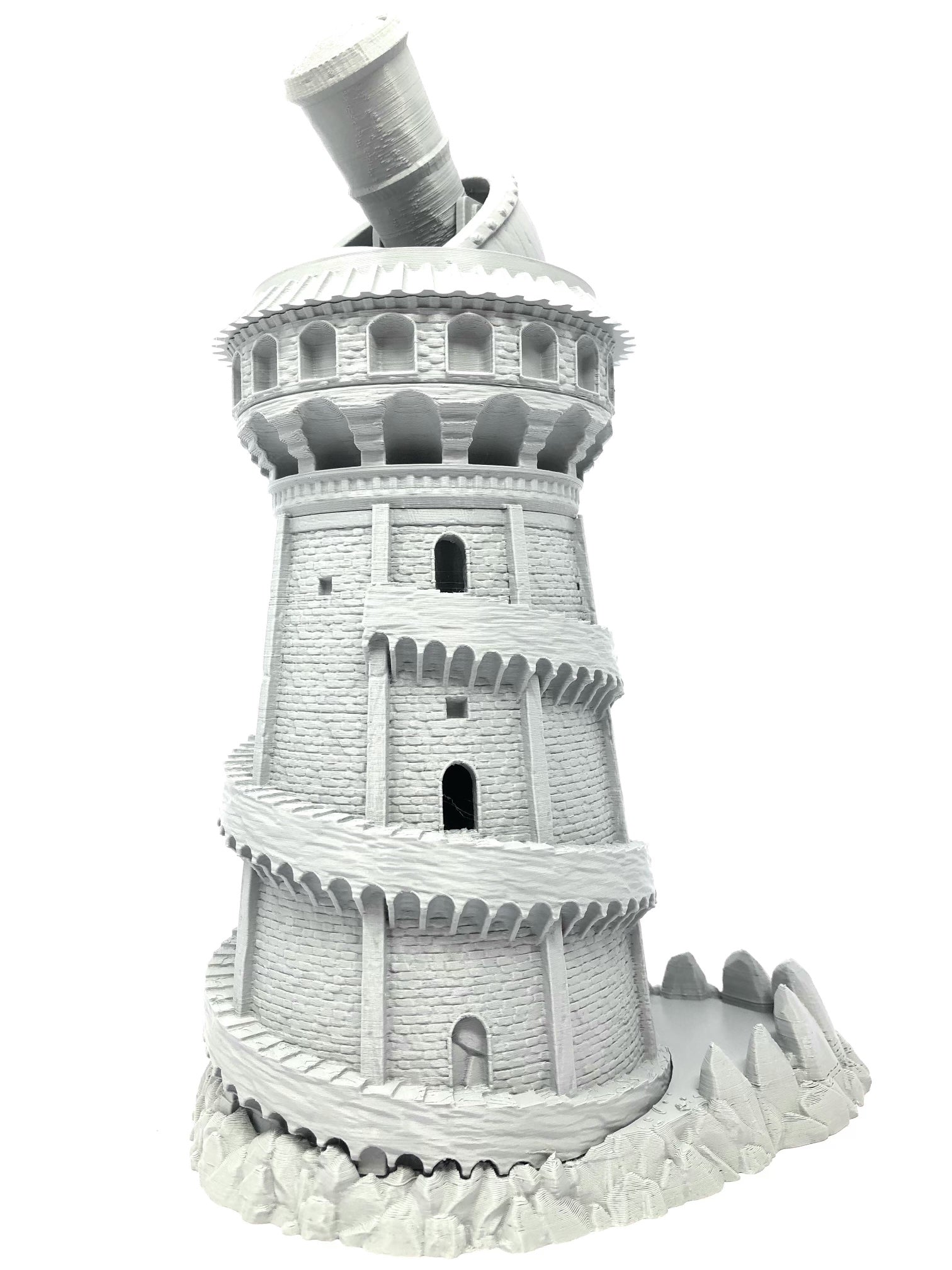 3D printed - detailed dice tower, with removable roof and exchangeable dice tray. The Dice Tower can also be used as a terrain part for your miniatures game or as a center piece for your next DnD session.