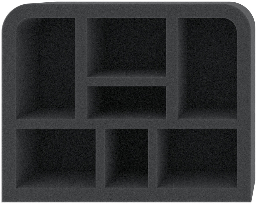 This 50 mm high foam tray is divided into 7 compartments. It is particularly suitable for the safe storage of tabletop and board game miniatures, as well as other fragile models and small parts.
