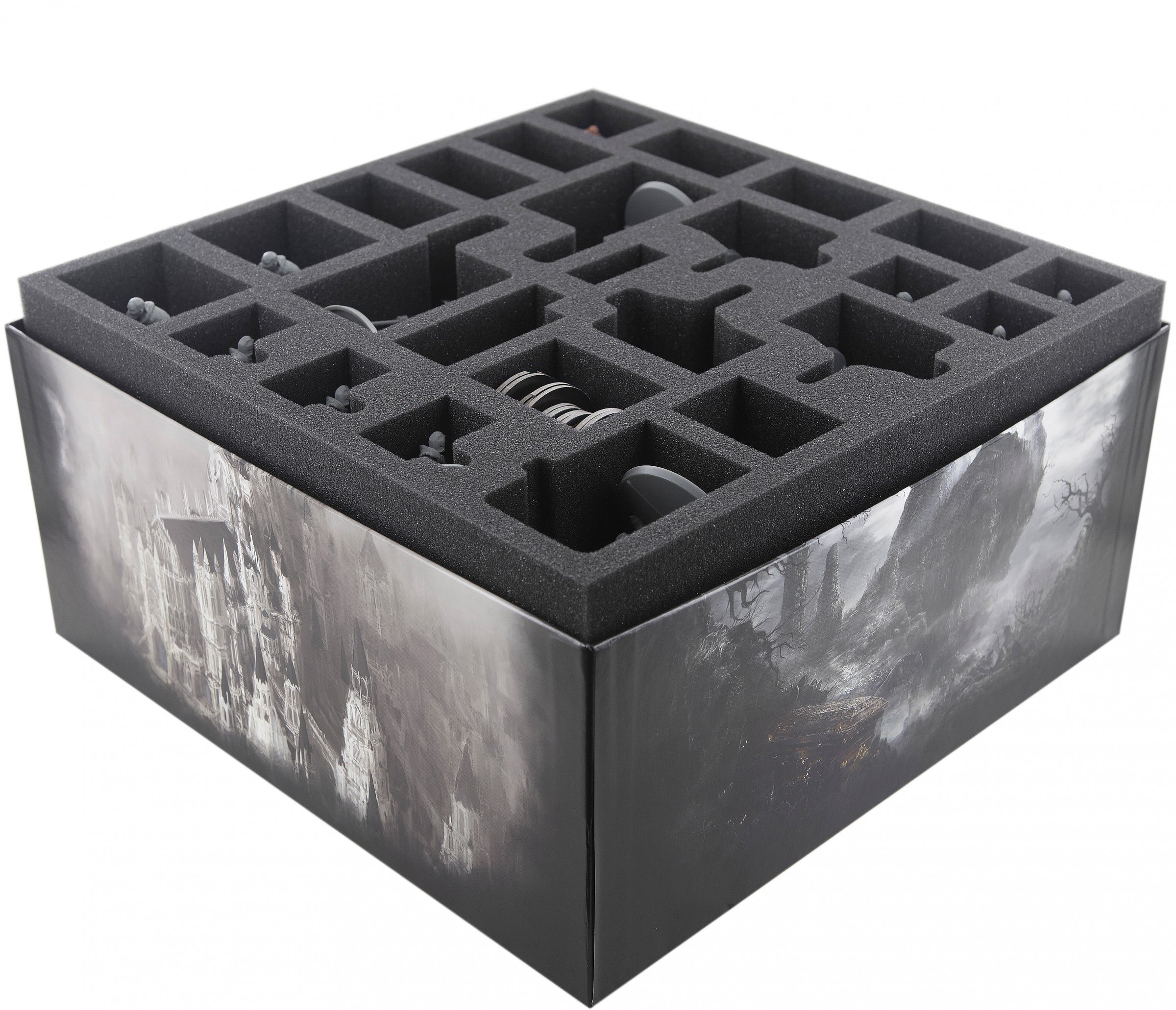 This foam set suitable for retrofitting all game content from the Dark Souls board game box. The different sized compartments are suitable for characters, enemies, bosses, markers and cards in sleeves. The foam trays fits perfectly into the original board game box, or into the Feldherr box LBBG. Foam extends over the edge of the board game box.