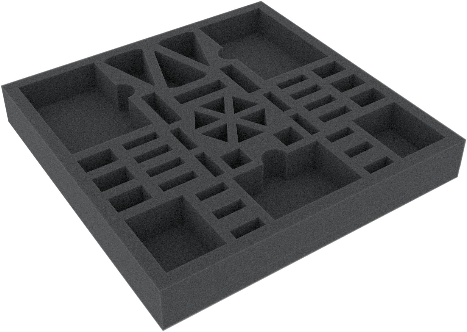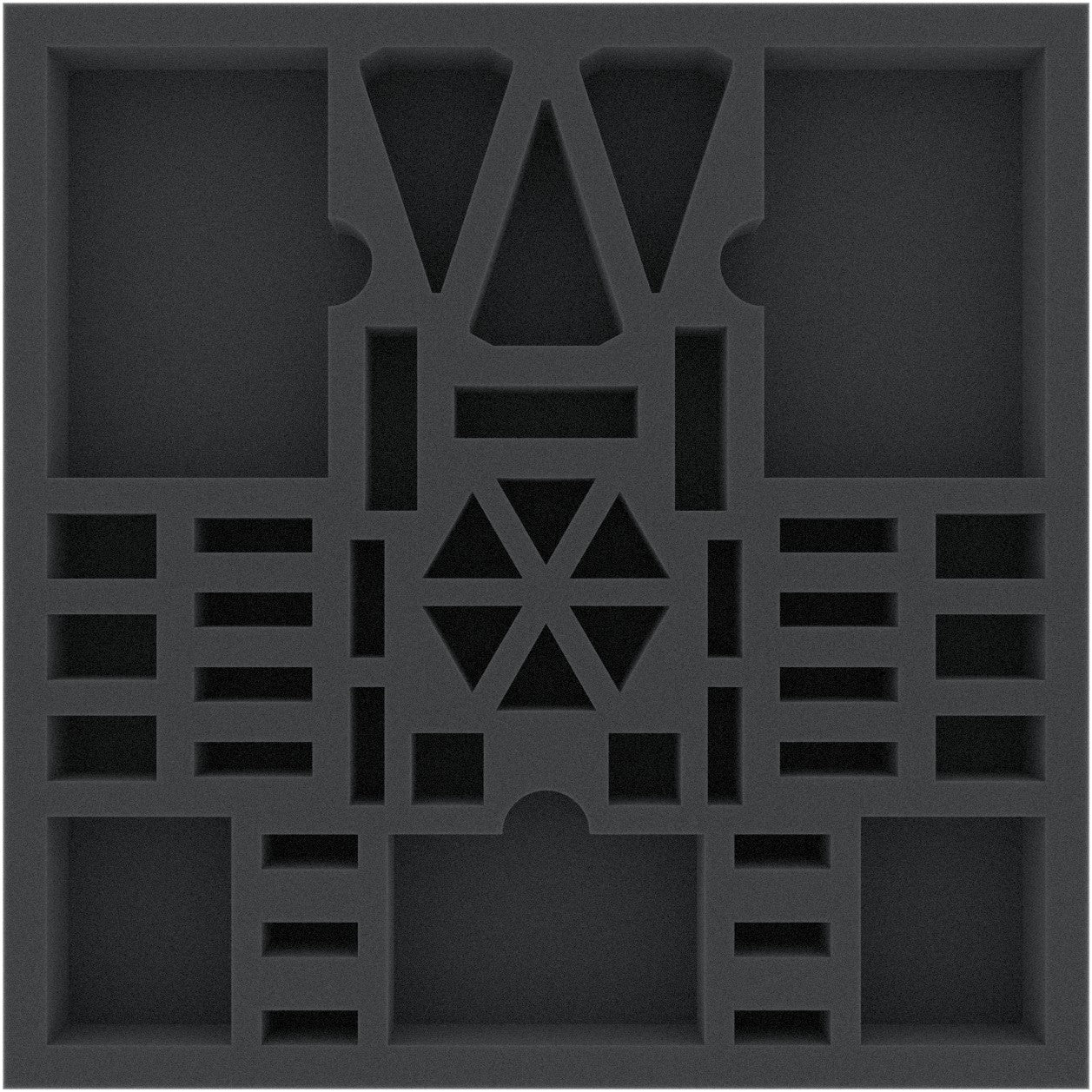 This foam tray is specially developed for the expansion „Star Wars: Rebellion – Rise of the Empire“. In the 43 compartments all components have space. So you find the fitting cut-outs for the Leaders with Stands, Attachment Rings, Target Markers, Dices, all Plastic Figures, but also for Misson Cards, Objective Cards, Advanced Tactic Cards and Action Cards in sleeves. The mat fits exactly into the expansion box. In addition, a 10 mm foam topper is included.