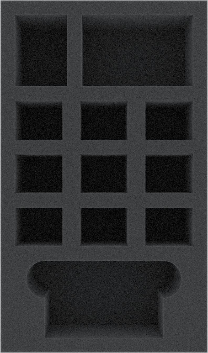Foam insert for the small Sin box. The insert is 238 mm x 140 mm x 55 mm and comes with a matching topper. There is enough space for 6 Abominations, 1 Avatar and 1 Comtroller, as well as the cards (with or without sleeves) and accessories.
