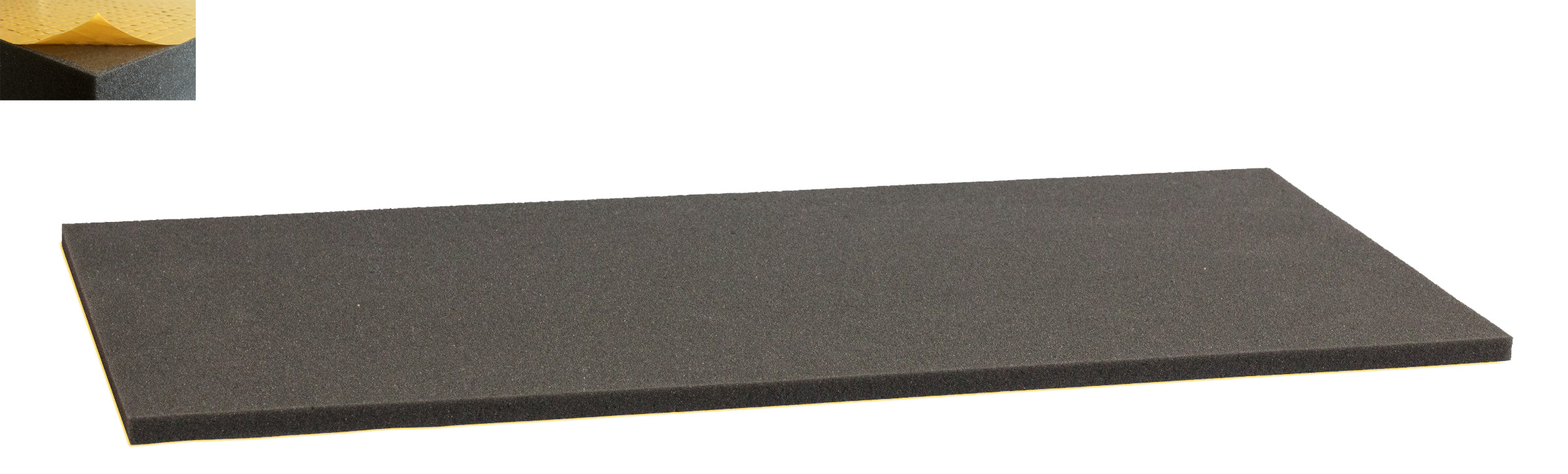 Gran corte de espuma Feldherr. Esta espuma se puede pegar como material de amortiguación en cajas, cajones y maletines de herramientas. El recubrimiento autoadhesivo de una cara está listo para su uso en superficies secas y limpias. El recubrimiento fija la espuma permanentemente en su posición.