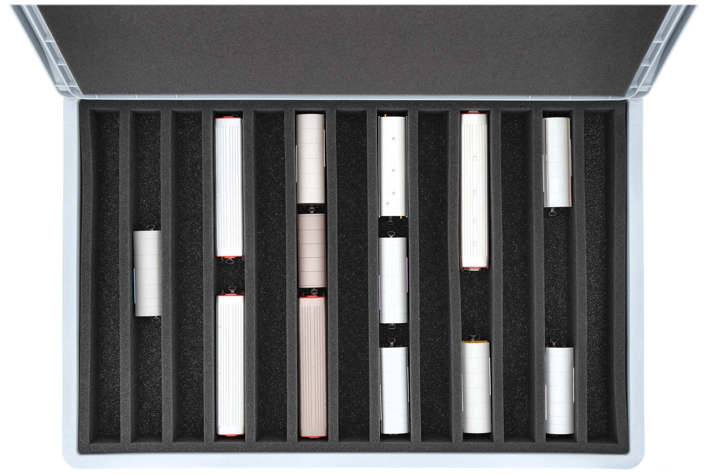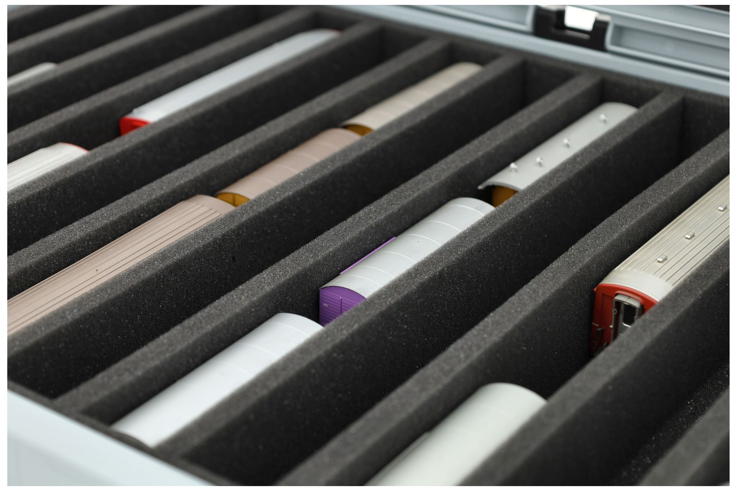Los 13 compartimentos de igual tamaño (cada uno de aprox. 350 x 33 x 45 mm) están especialmente diseñados para modelos a escala H0m. El ajuste preciso mantiene sus modelos en su sitio durante el transporte.