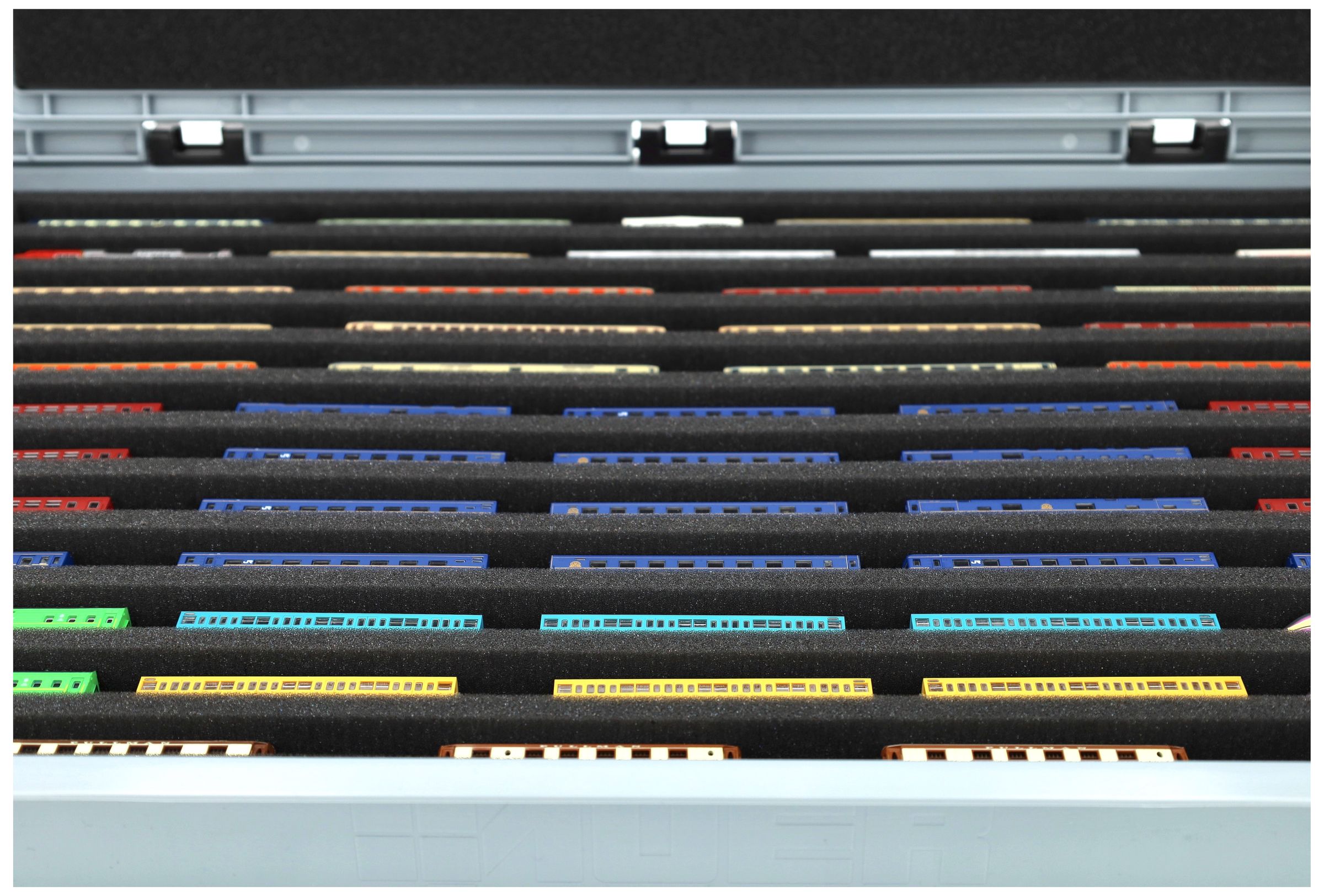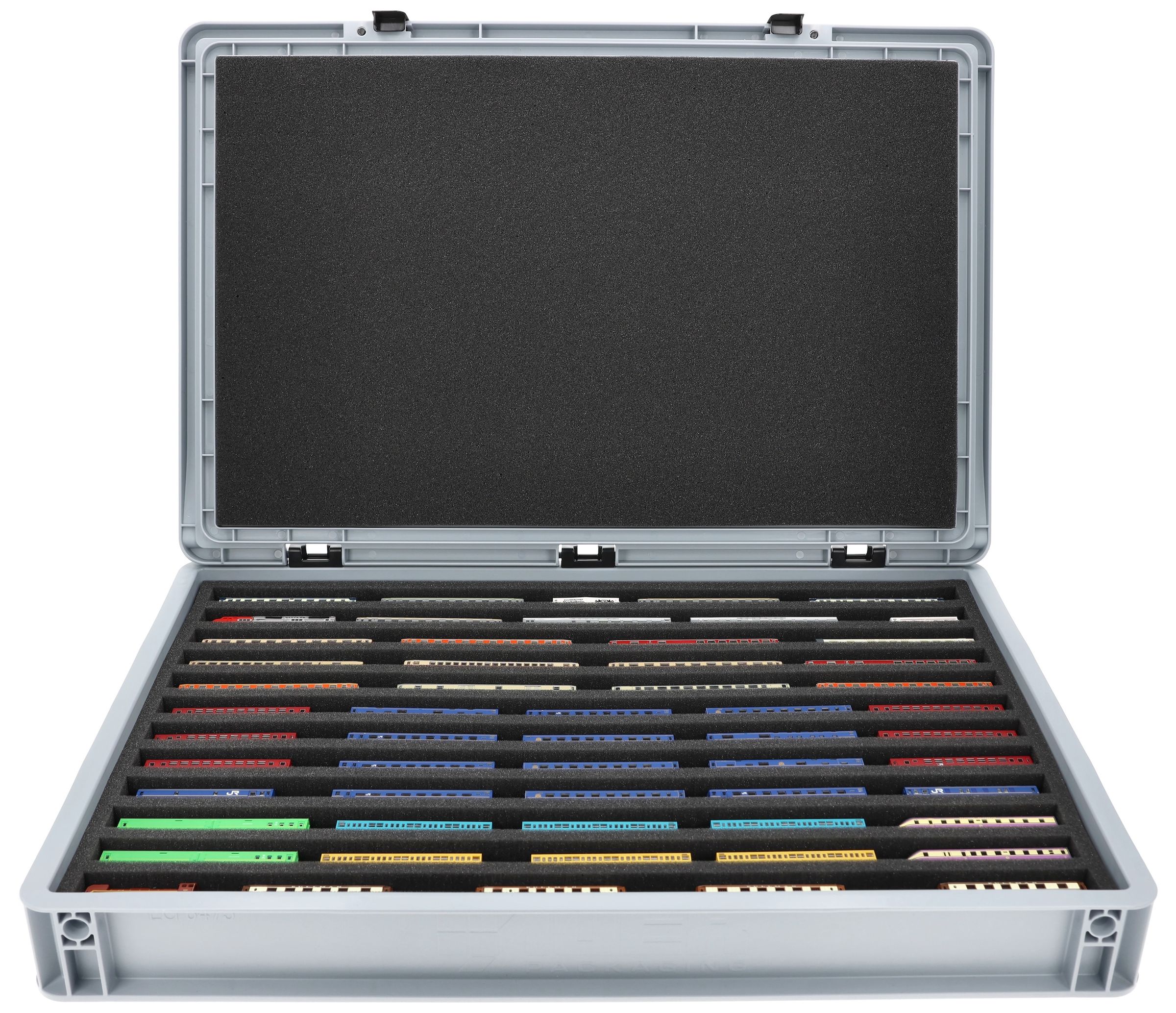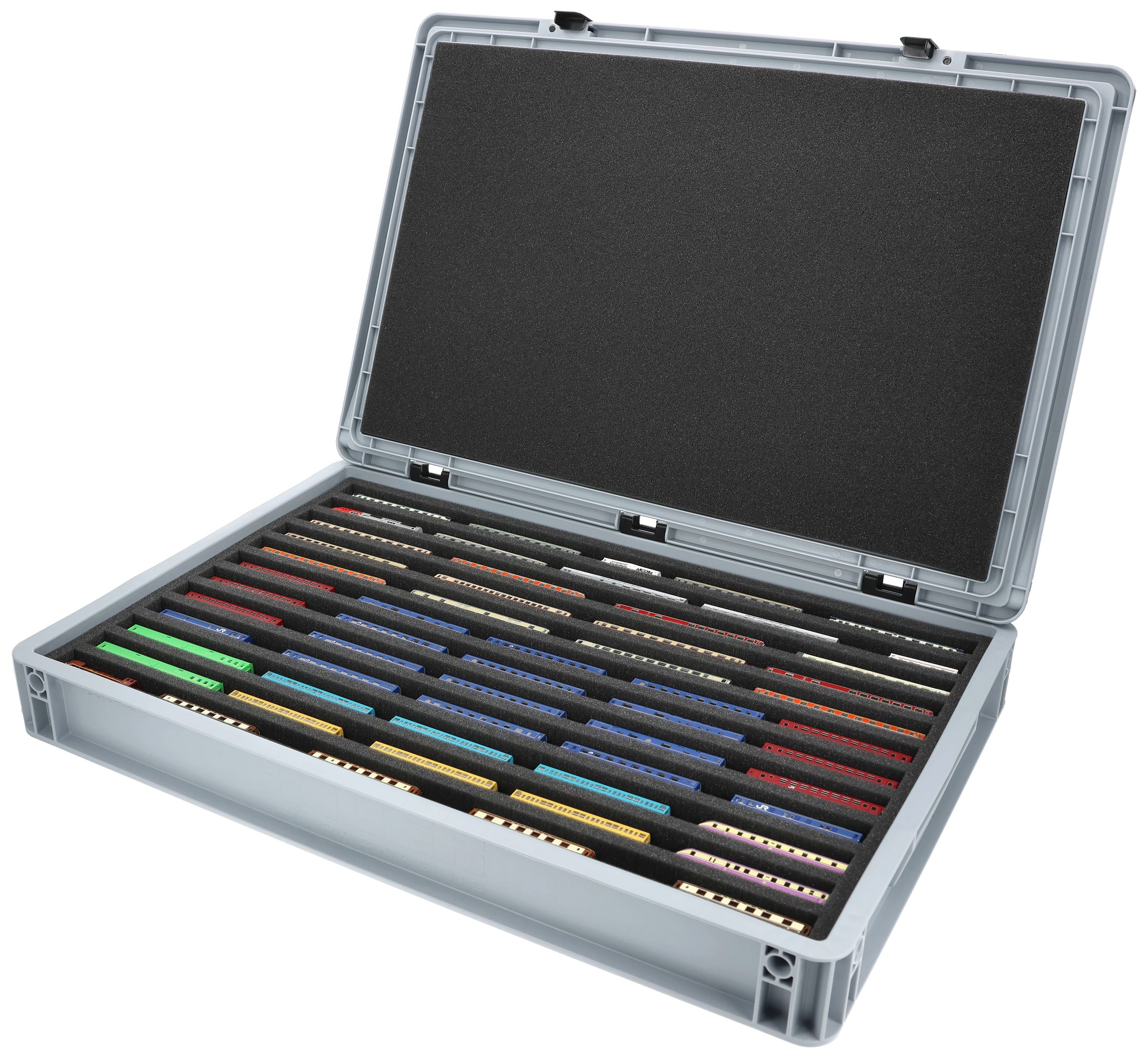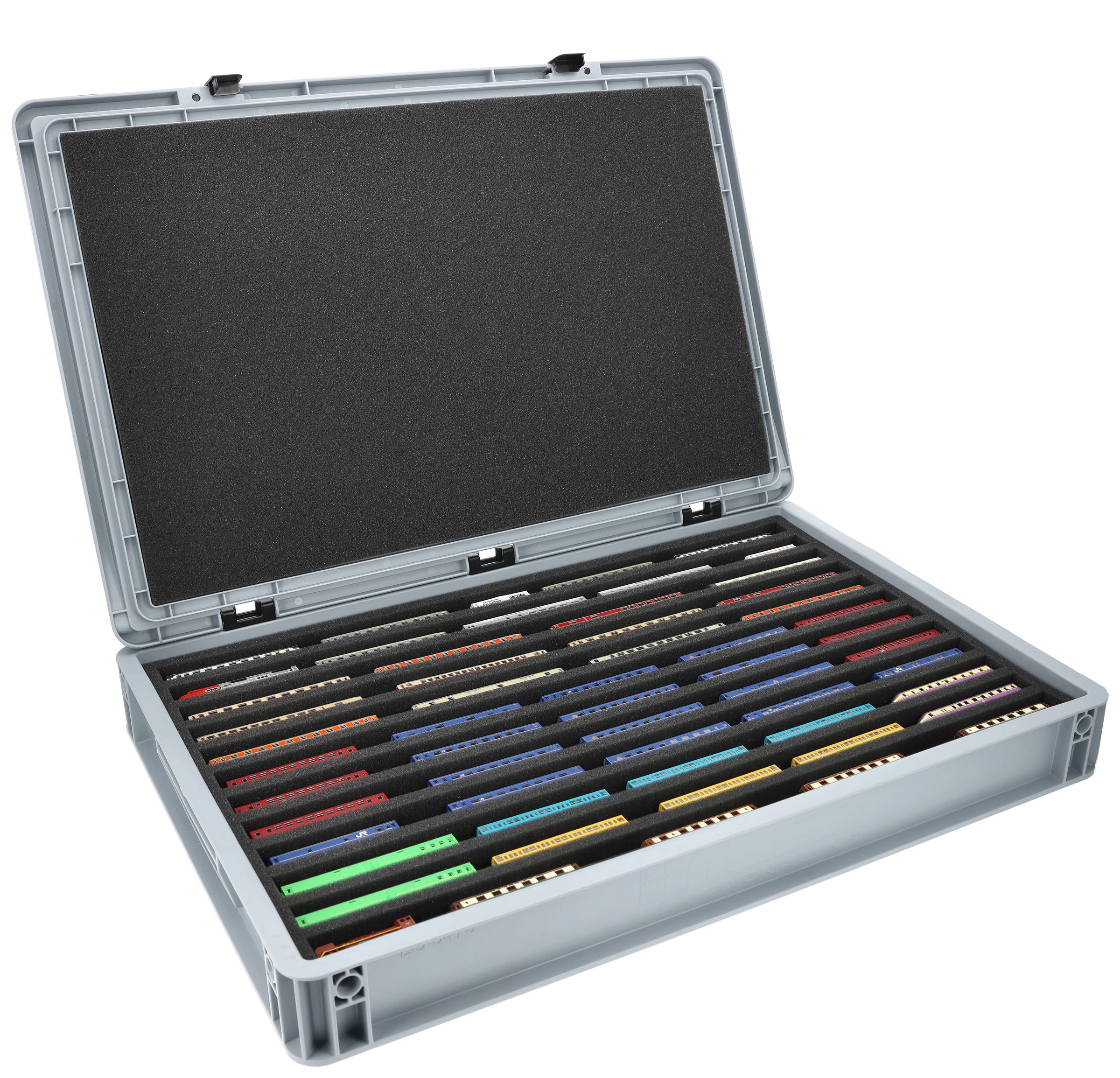 Los 12 compartimentos de igual tamaño (cada uno de aprox. 550 x 20 x 20 mm) están especialmente diseñados para modelos a escala Z. La posición horizontal mantiene protegidos los pantógrafos y las piezas delicadas, al tiempo que garantiza la estabilidad de las maquetas durante el transporte.