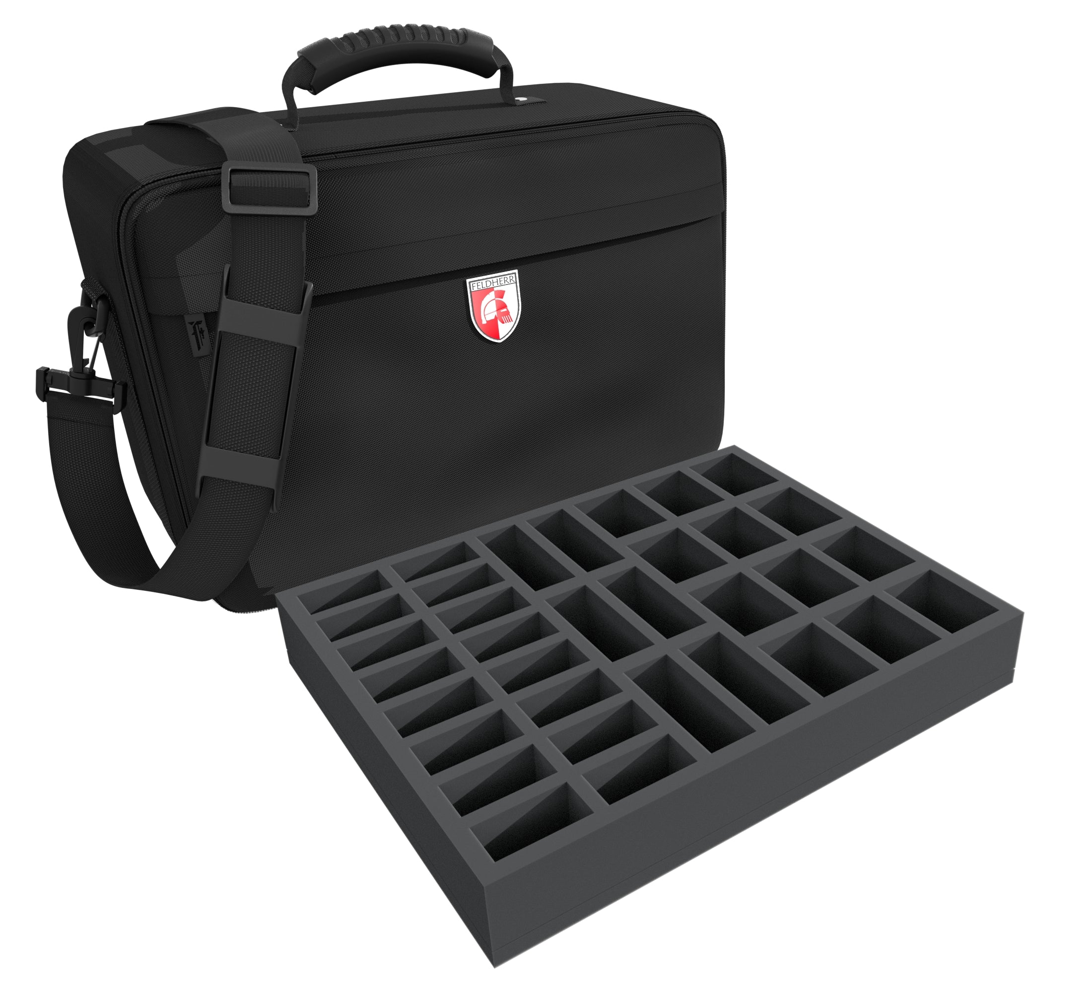 Y por supuesto el juego también viene con una inserción de espuma Full-Size para hasta 34 miniaturas. Es adecuado para muchas figuras estándar de guerreros, monstruos y héroes de diferentes sistemas de juegos de mesa y de tablero en una base de 25 o 40 mm.