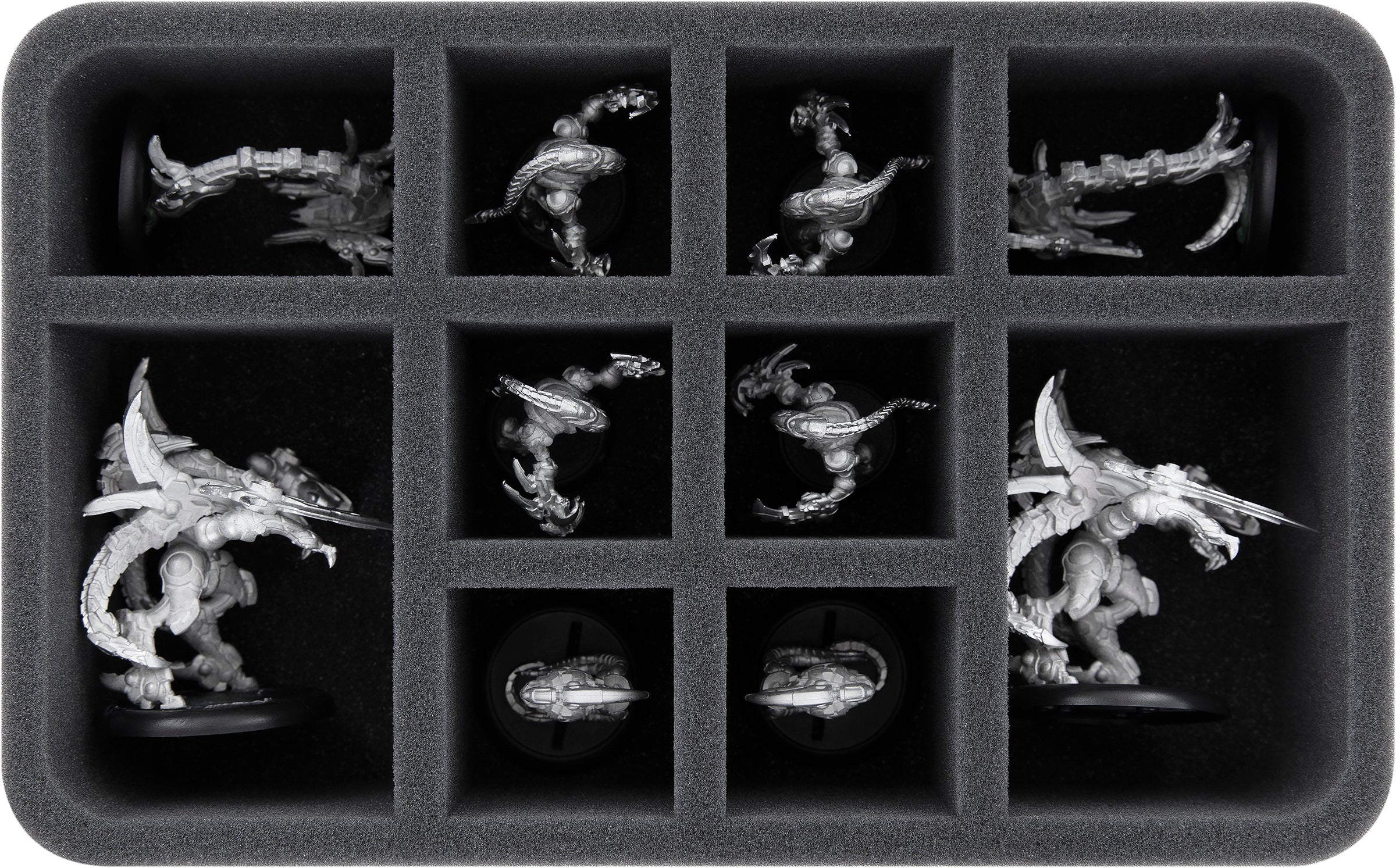 Gracias al corte a medida, las miniaturas quedan bien ajustadas. Incluso si el transporte es un poco accidentado, las figuras se mantienen en su sitio. La espuma blanda de poros finos protege los detalles delicados para que no se rompan y los colores de tus modelos pintados para que no se rayen ni se raspen.
