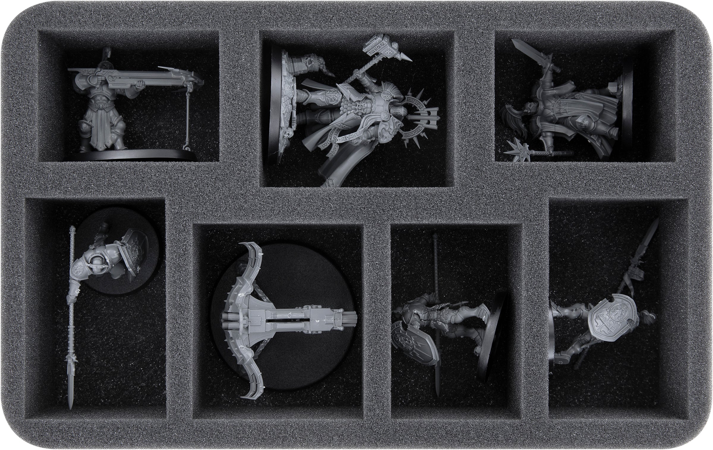 Los compartimentos cortados a medida proporcionan una protección fiable para tus miniaturas, evitando que se dañen. La suave espuma también garantiza que tus unidades pintadas lleguen al tablero sin arañazos ni abrasión de la pintura.