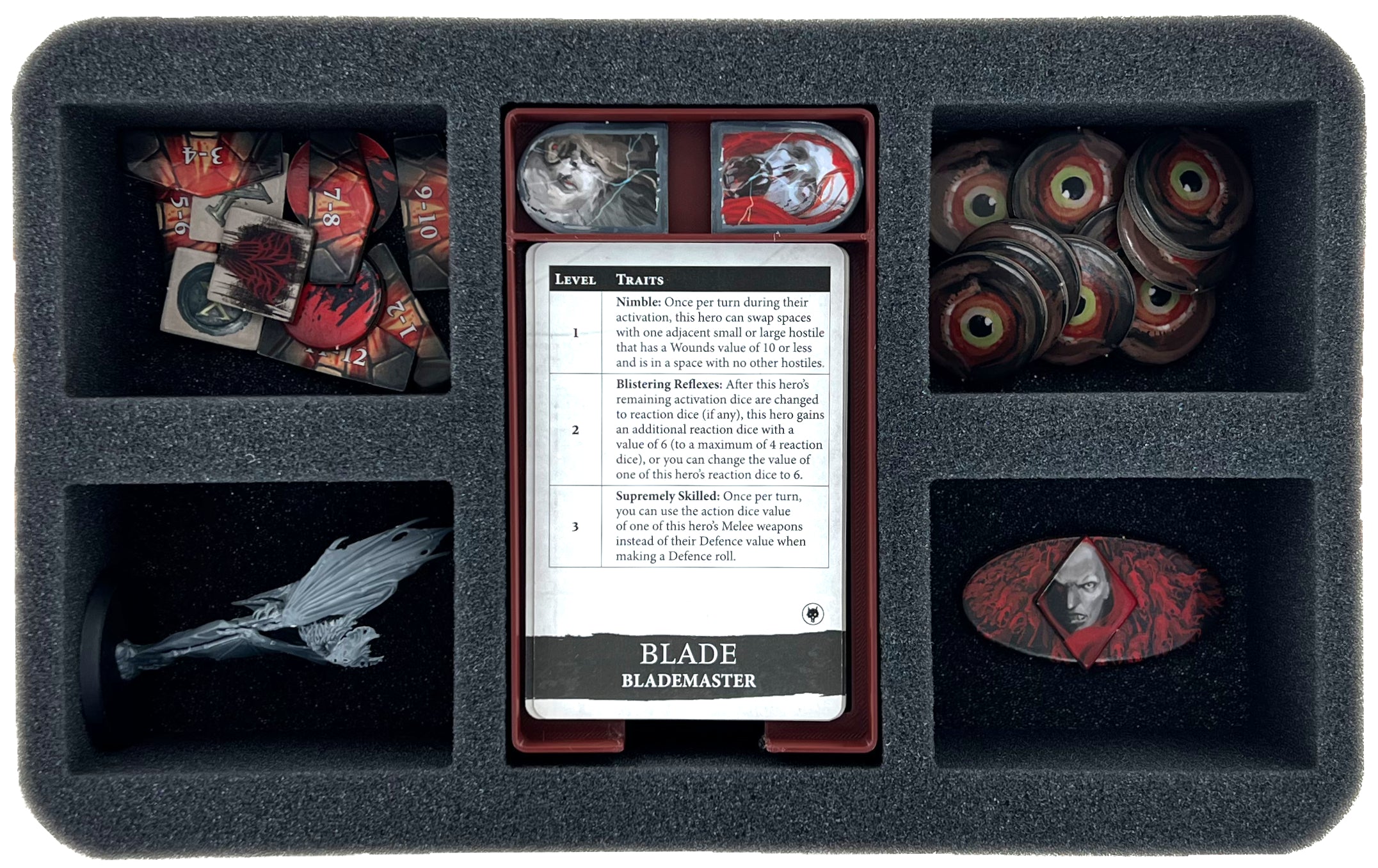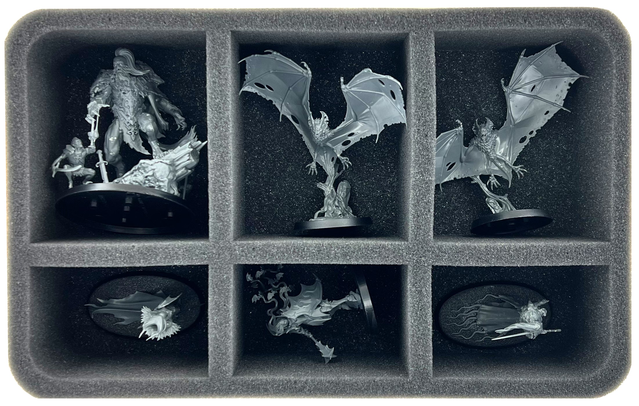 • 1 Half-Size bandeja de espuma con seis compartimentos para miniaturas como Radukar la Bestia, Lady Annika, Kritza, Carmilla DuSang, y Murciélagos Caídos