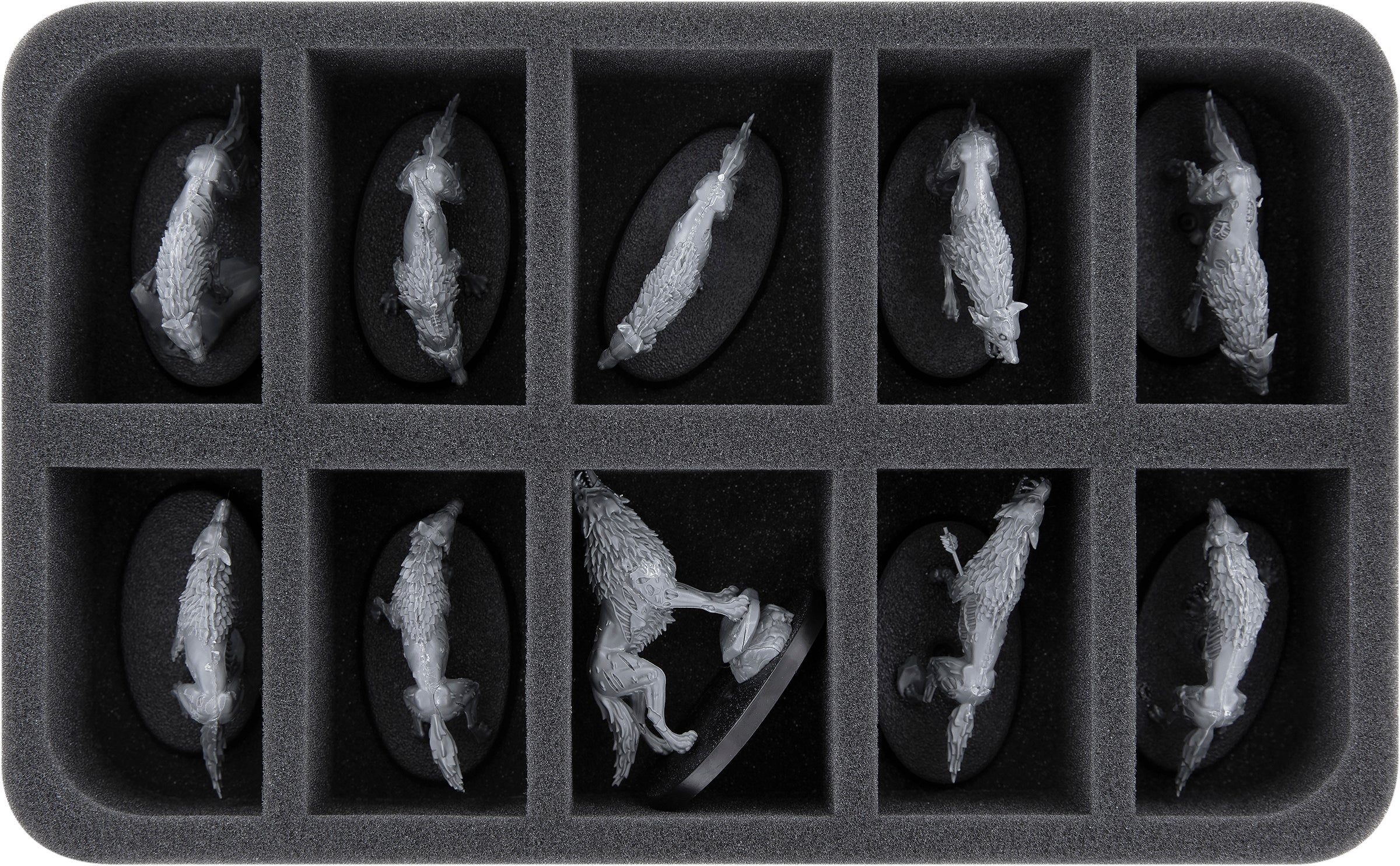 • 1 Half-Size bandeja de espuma con diez compartimentos para miniaturas como Dire Wolves (HS050A077)