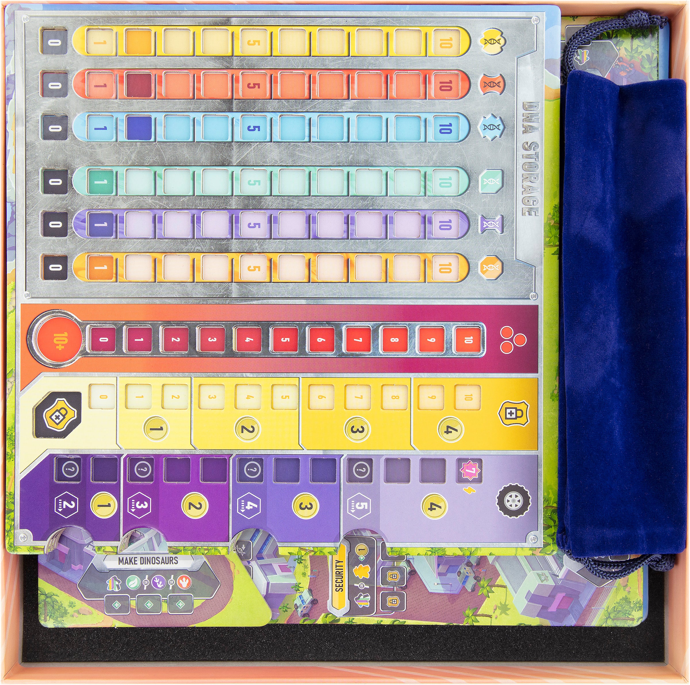 - 1 soporte de dados de plástico con seis compartimentos para marcadores de primer jugador, dados de ADN, dados de peligro, marcadores de ronda, marcadores de recursos, Jeeples + hueco para tarjetas de acción pública/privada y tarjetas de puntuación de resumen de ronda/final de partida