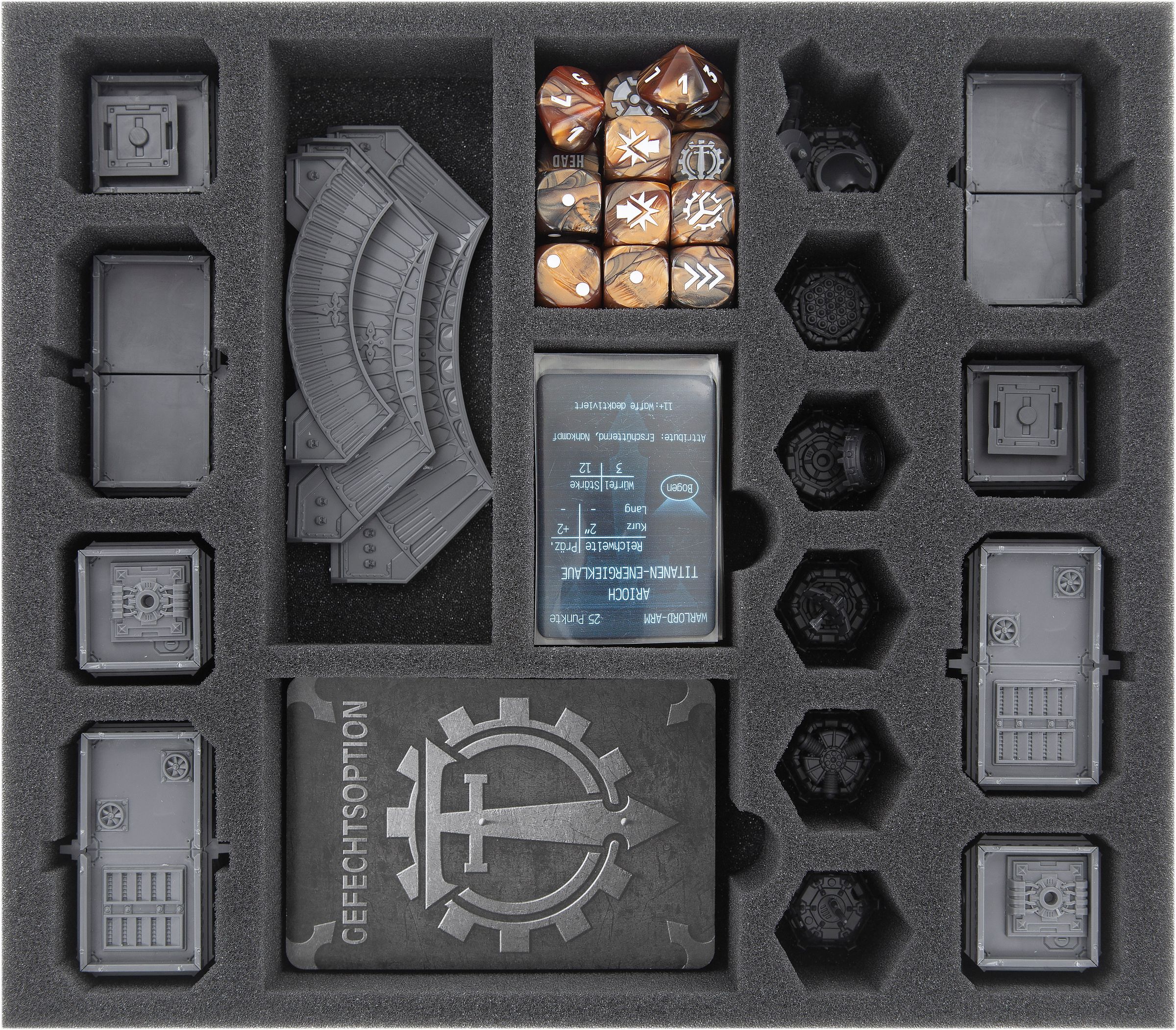 El libro de reglas, las hojas de referencia, los terminales de mando, así como la regla de rango, los marcadores de chorro transparentes y una plantilla de llama pueden colocarse en la parte superior de la espuma.