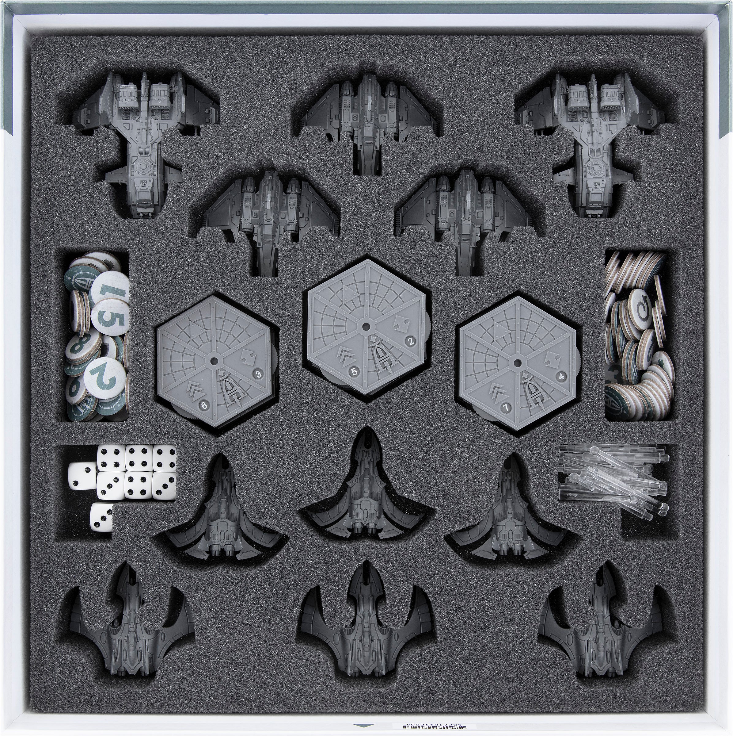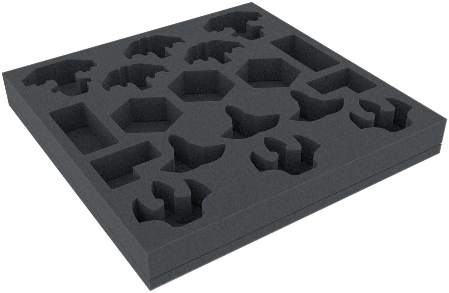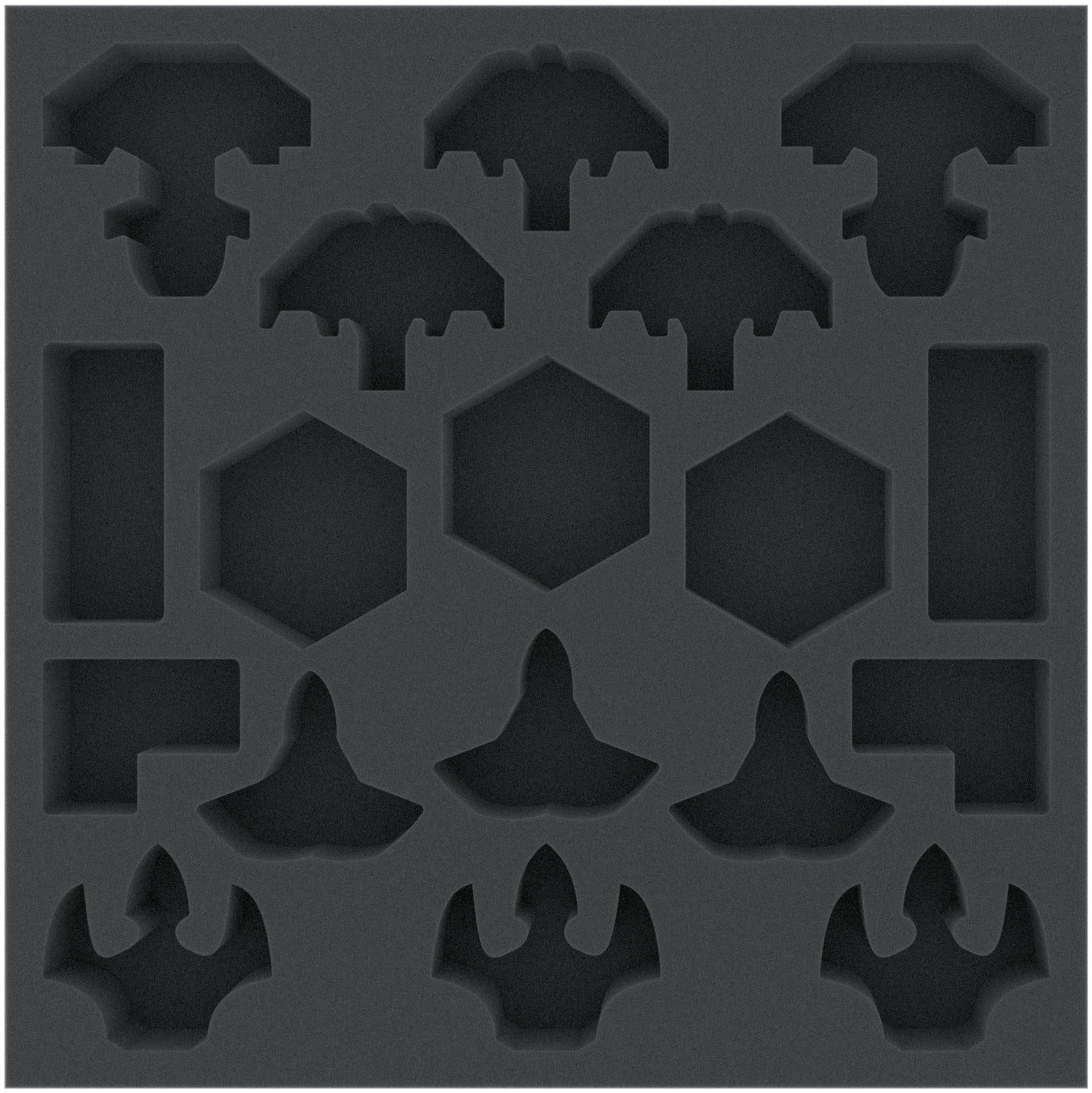 En la bandeja de espuma Feldherr, hecha a medida para la caja original del juego de mesa, tienes 11 compartimentos para guardar tus miniaturas. Las dos Águilas de Tormenta Adeptus Astartes y los tres Interceptores Xifón, así como los tres modelos de Alas Nocturnas Asuryani y los tres Bombarderos Fénix, cuentan con compartimentos cortados con precisión para las miniaturas. El corte a medida evita que tus miniaturas se deslicen durante las fuertes turbulencias y que choquen entre sí durante el transporte.
