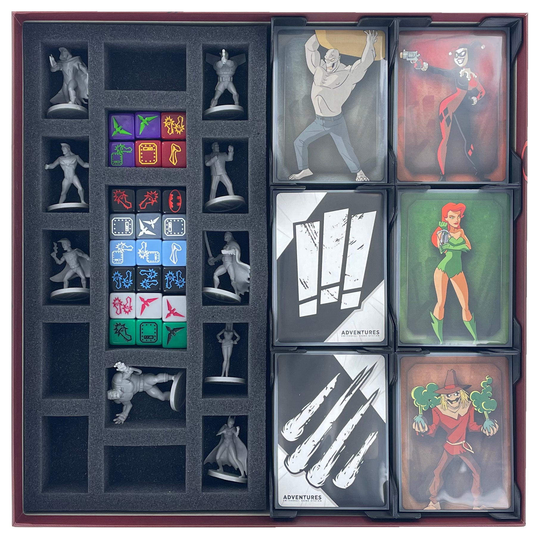 Para que tus figuras siempre rindan al máximo cuando luchan contra el crimen o cuando están involucradas en actividades delictivas, el juego viene con un inserto espuma a juego. Ya sea Nightwing o Bane, cada miniatura recibe un compartimento a medida. El suave espuma protege a tus modelos de los detalles que se rompen. Y si has pintado tus figuras, el espuma de alta calidad las protege de la abrasión de la pintura y de los feos arañazos. Además, aquí puedes ordenar los dados de forma ordenada.